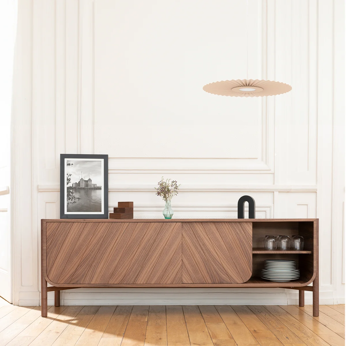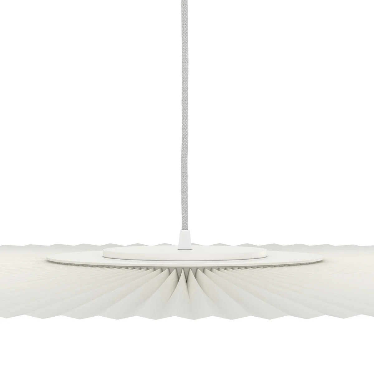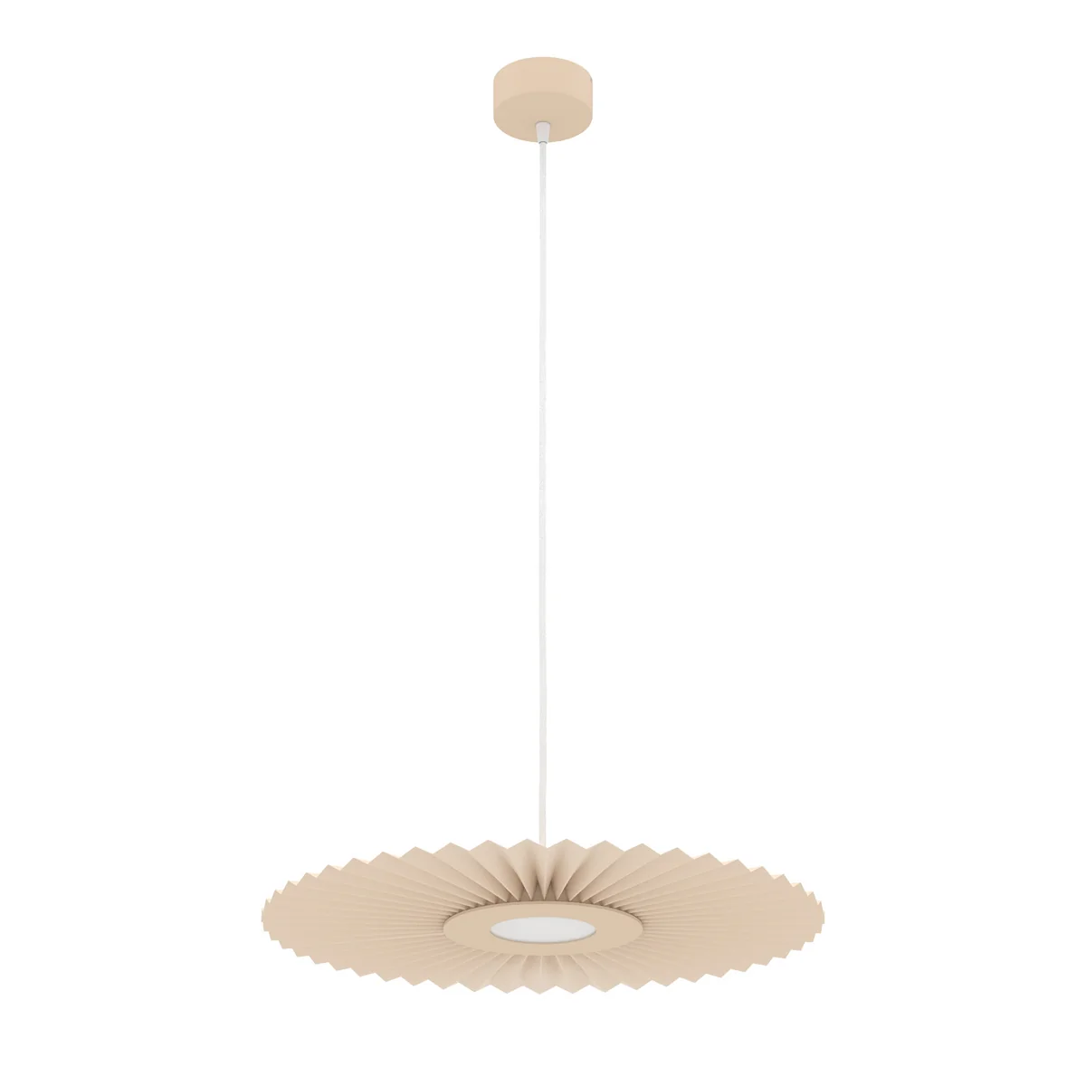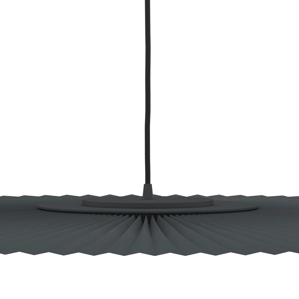 Hartô De Carmen LED hanglamp van wordt gekenmerkt door haar plaatvormige geplooide kap, die er tegelijkertijd elegant en een beetje speels uitziet. De kap is gemaakt van PES-stof, d.w.z. 100% polyester met een PVC-coating. Het materiaal is nauwkeurig gevouwen en binnenin voorzien van een LED-lampje en een diffusorschijf. De plooien die uit het midden komen, lijken op zonnestralen die zachtjes worden verlicht door het LED-lampje.