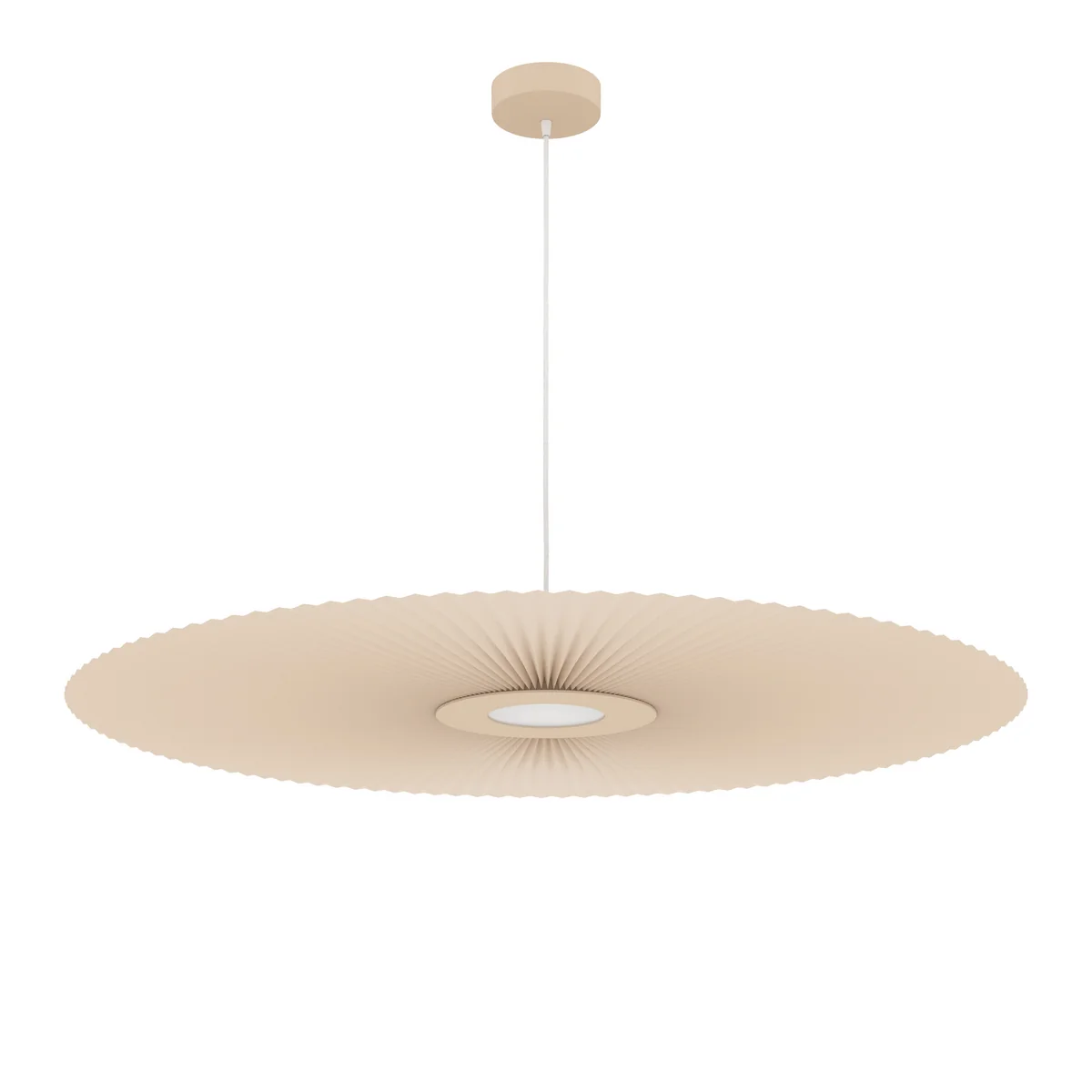 Hartô De Carmen LED hanglamp van wordt gekenmerkt door haar plaatvormige geplooide kap, die er tegelijkertijd elegant en een beetje speels uitziet. De kap is gemaakt van PES-stof, d.w.z. 100% polyester met een PVC-coating. Het materiaal is nauwkeurig gevouwen en binnenin voorzien van een LED-lampje en een diffusorschijf. De plooien die uit het midden komen, lijken op zonnestralen die zachtjes worden verlicht door het LED-lampje.
