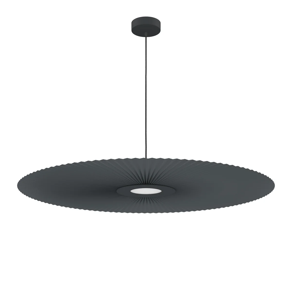 Hartô De Carmen LED hanglamp van wordt gekenmerkt door haar plaatvormige geplooide kap, die er tegelijkertijd elegant en een beetje speels uitziet. De kap is gemaakt van PES-stof, d.w.z. 100% polyester met een PVC-coating. Het materiaal is nauwkeurig gevouwen en binnenin voorzien van een LED-lampje en een diffusorschijf. De plooien die uit het midden komen, lijken op zonnestralen die zachtjes worden verlicht door het LED-lampje.