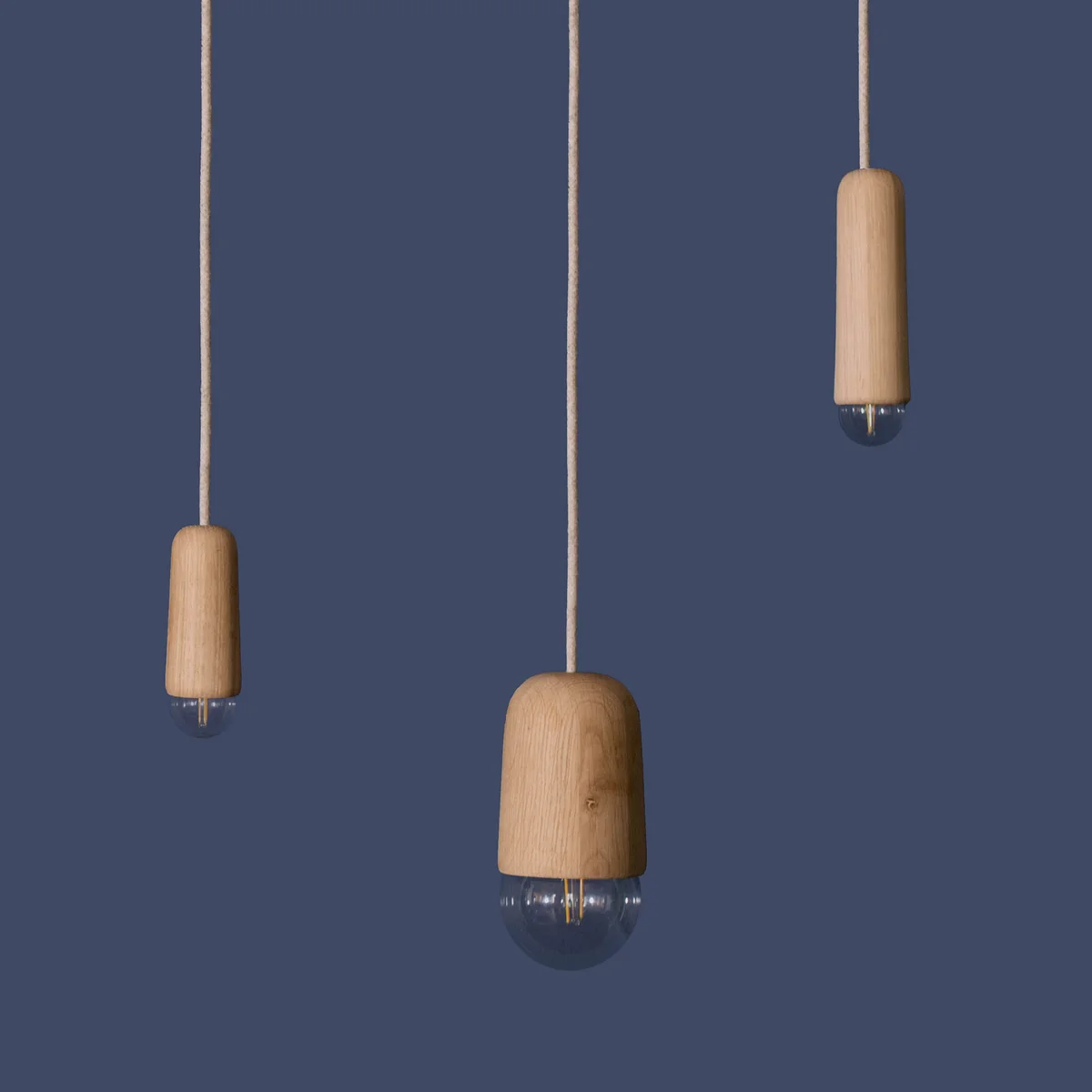 Bestaande uit een textielkabel, een eikenhouten omhulsel voor de fitting en een lamp die veilig door het eikenhouten omhulsel wordt omhuld, straalt de armatuur een rustgevende sfeer uit en zorgt zij voor warm licht in elke ruimte.