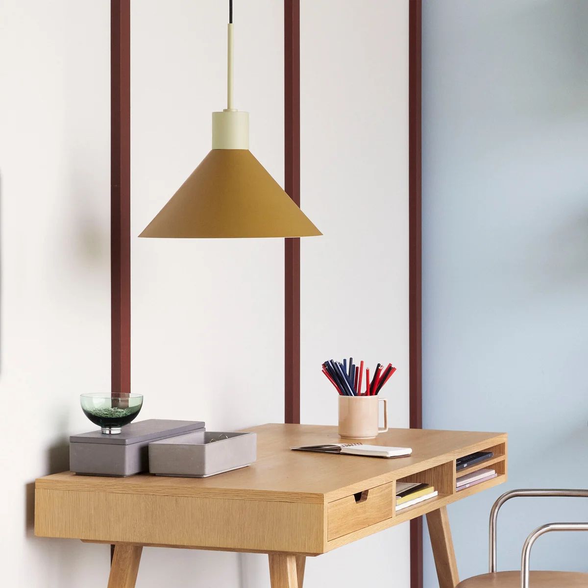 De metalen hanglamp van Hübsch Interior overtuigt met zijn minimalistische en tijdloze look in betoverende kleuren. De kegelvormige lampenkap is bijzonder decoratief in twee kleuren en wordt zo een blikvanger boven de eettafel in het woongedeelte.