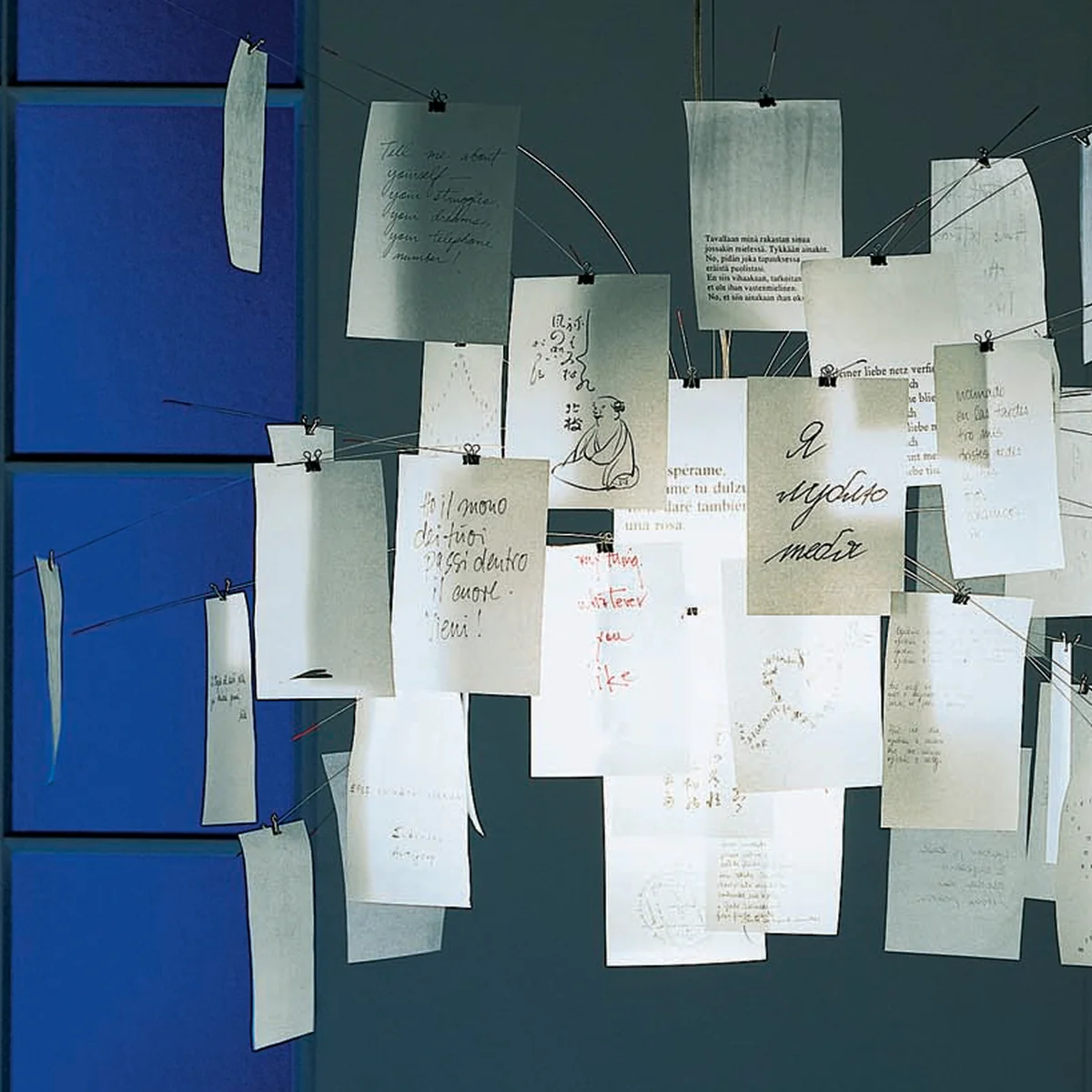 Zettel'z 5 is gemaakt van roestvrij staal en hittebestendig matglas. De biljetten die met kleine clips aan de lamp zijn bevestigd, zijn gemaakt van Japans papier. De hanglamp wordt geleverd met 31 bedrukte en 49 onbedrukte vellen in A5-formaat.