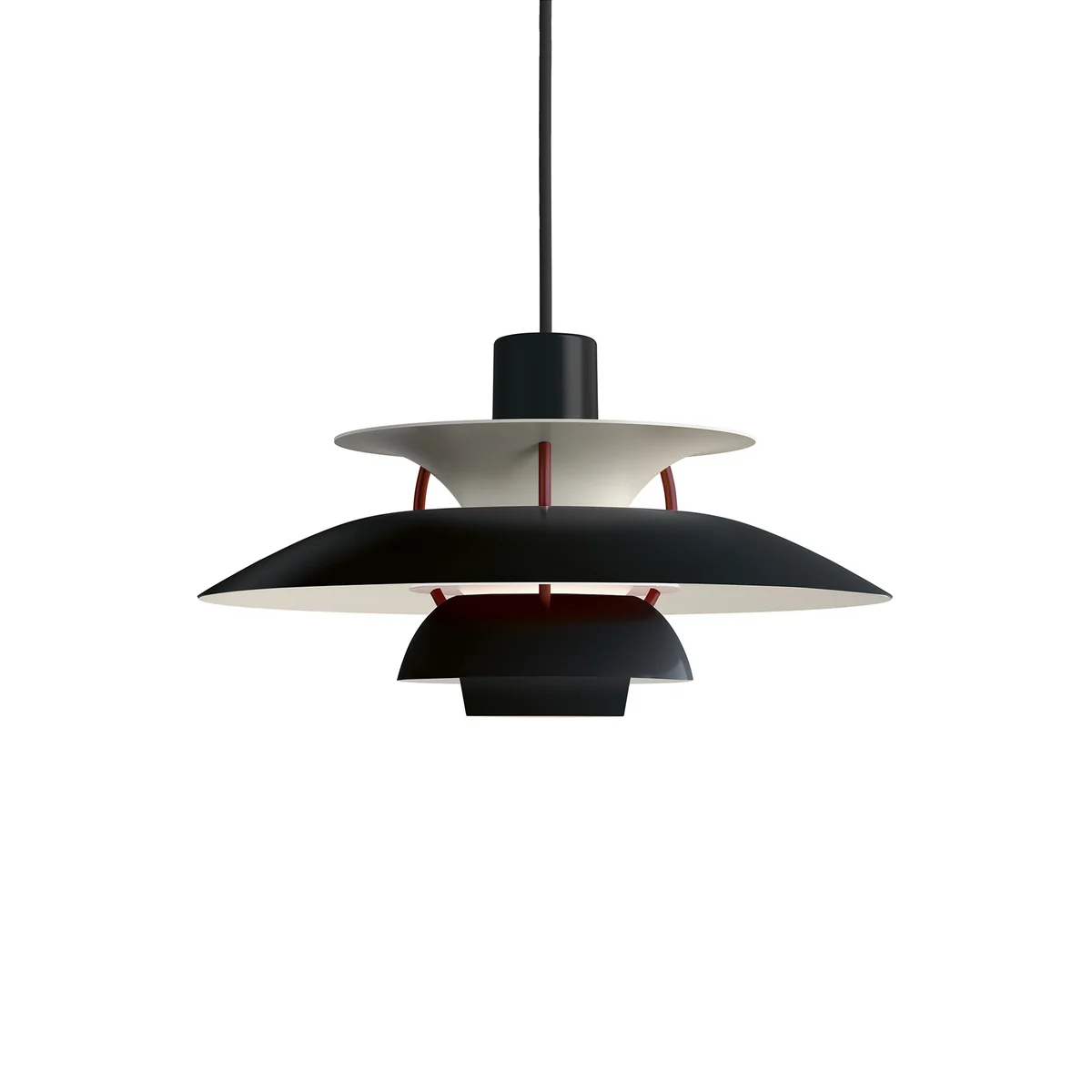 De PH 5 Mini Black Friday Edition 2025 miniaturiseert het iconische ontwerp van Poul Henningsen zonder afbreuk te doen aan kwaliteit of impact. In deze gelimiteerde speciale editie presenteert het armatuur zich in een elegante combinatie van mat gelakte zwarte aluminium kappen, wit gelakte details en structurele elementen in Monochrome Burgundy. Het compacte formaat is ideaal voor kleinere ruimtes, terwijl het driedelige kapsysteem zorgt voor een gelijkmatige, niet-verblindende verlichting. Een matglazen diffuser verfijnt het lichtbeeld nog meer - stijlvol, tijdloos en functioneel.