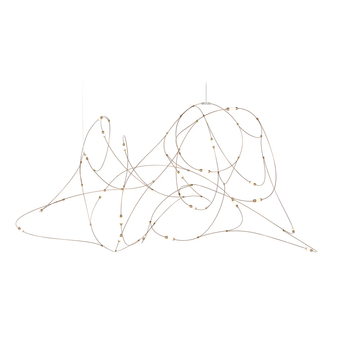 De lamp is verkrijgbaar in drie maten - 11, 21 en 31 - voor elke kamergrootte of tafelopstelling. Filigraan bronzen draden leiden naar koperen kopjes die de semi-transparante diffusors vasthouden en een warm, sfeervol licht creëren.