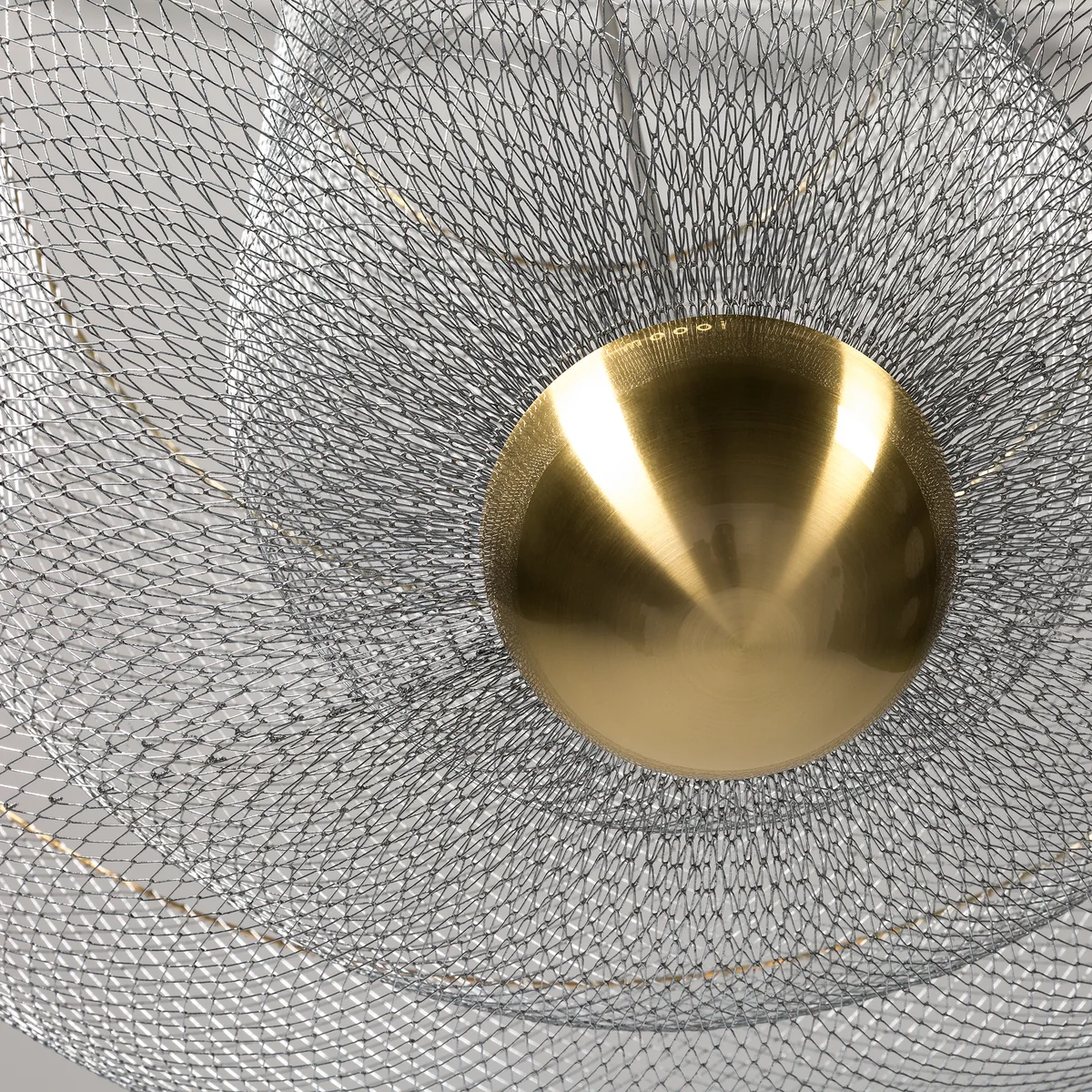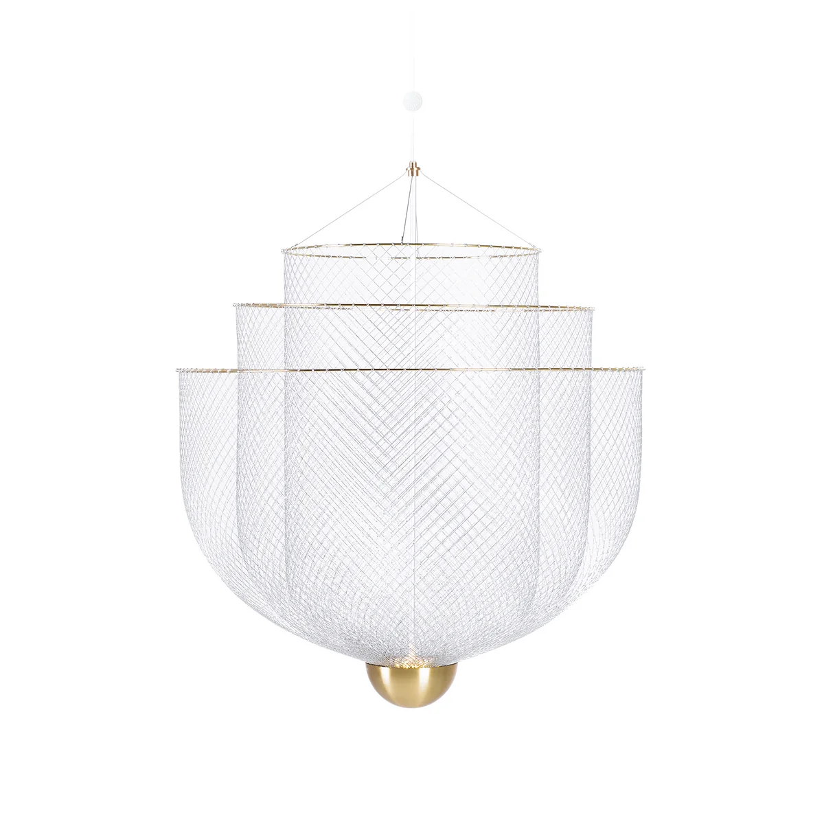 Moooi De kroonluchter Meshmatics is ontworpen door productontwerper Rick Tegelaar. Het elegante ontwerp van de kroonluchter is op een zeer artistieke manier gerealiseerd. De Nederlandse ontwerper ontwikkelde voor zijn kroonluchter een machine die het mogelijk maakt om het filigraan gaas naar eigen wens vorm te geven. De lampenkap bestaat uit drie dunne lagen gaasstructuur, die het licht van binnenin dit armatuur met prachtige patronen en schaduwen op de muren werpt.