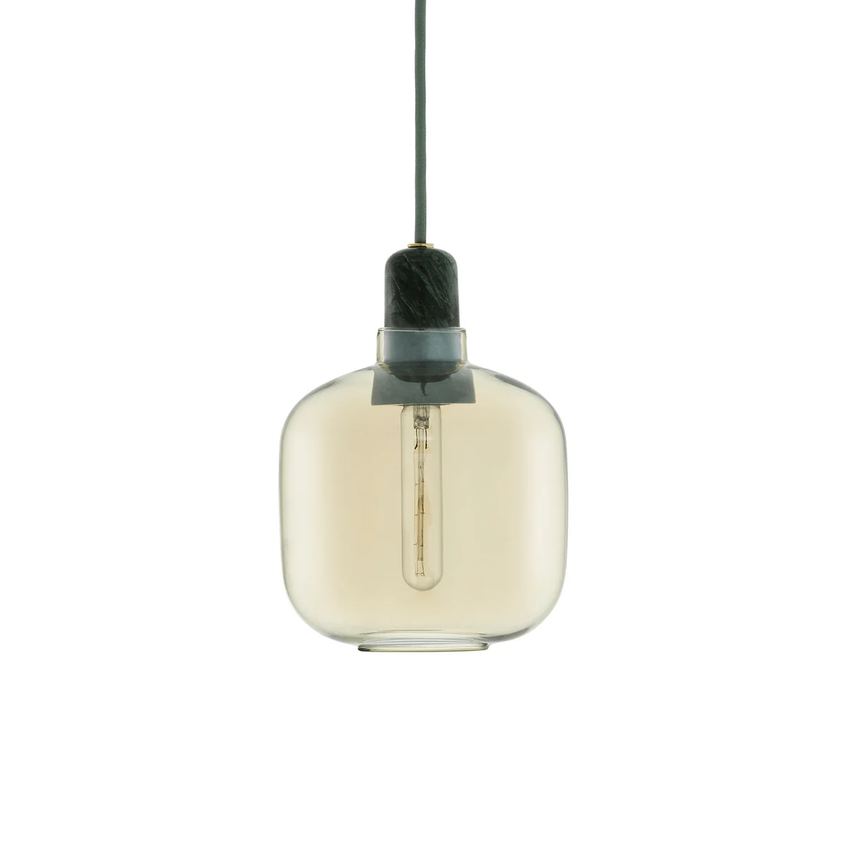 Beide versies zijn verkrijgbaar met een amp lampenkap in goud- of rookkleuren. De Amp hanglamp is verkrijgbaar met een fitting in opvallend zwart marmer of in glamoureus jadegroen, wat de natuurlijke elegantie van het materiaal benadrukt.