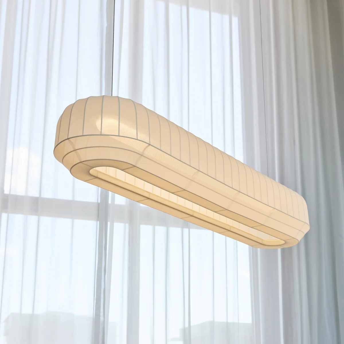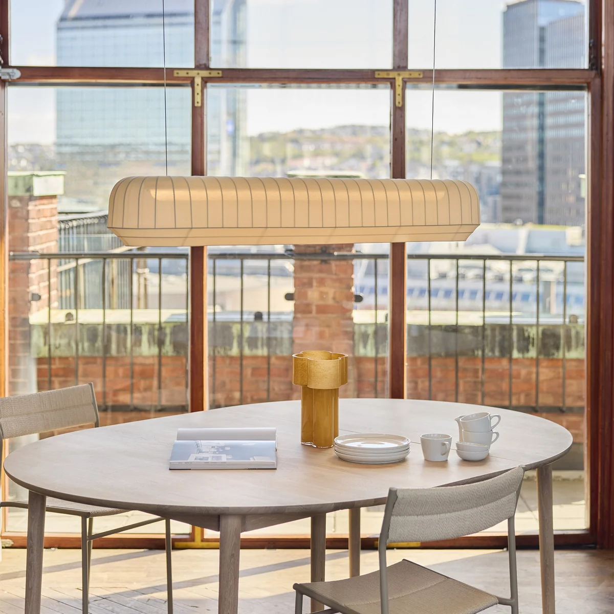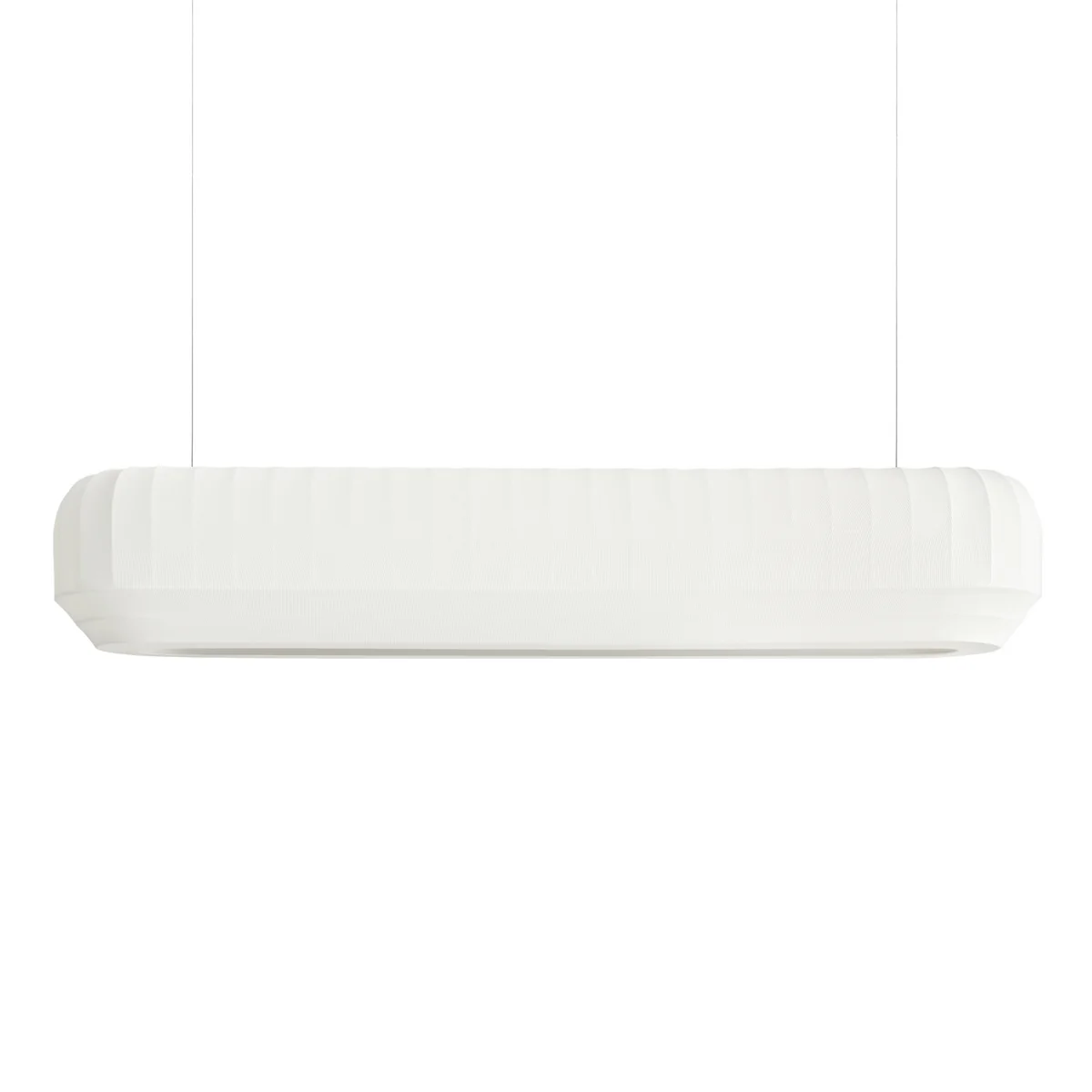 De Tradition serie is een elegante verlichtingscollectie die kamers vult met een warme, uitnodigende sfeer. De fijne, gebreide lampenkap van wit polyester is zorgvuldig gespannen over een wit metalen frame en creëert een zachte lichtspreiding die gezelligheid en stijl combineert. De lineaire hanglamp uit de collectie biedt een moderne oplossing voor het verlichten van eettafels, balies of werkplekken - ze heeft een licht en ingetogen effect terwijl ze toch aanwezig blijft in de ruimte. De combinatie van gestructureerde vorm en zacht oppervlak maakt het een functioneel designobject met een decoratief effect.