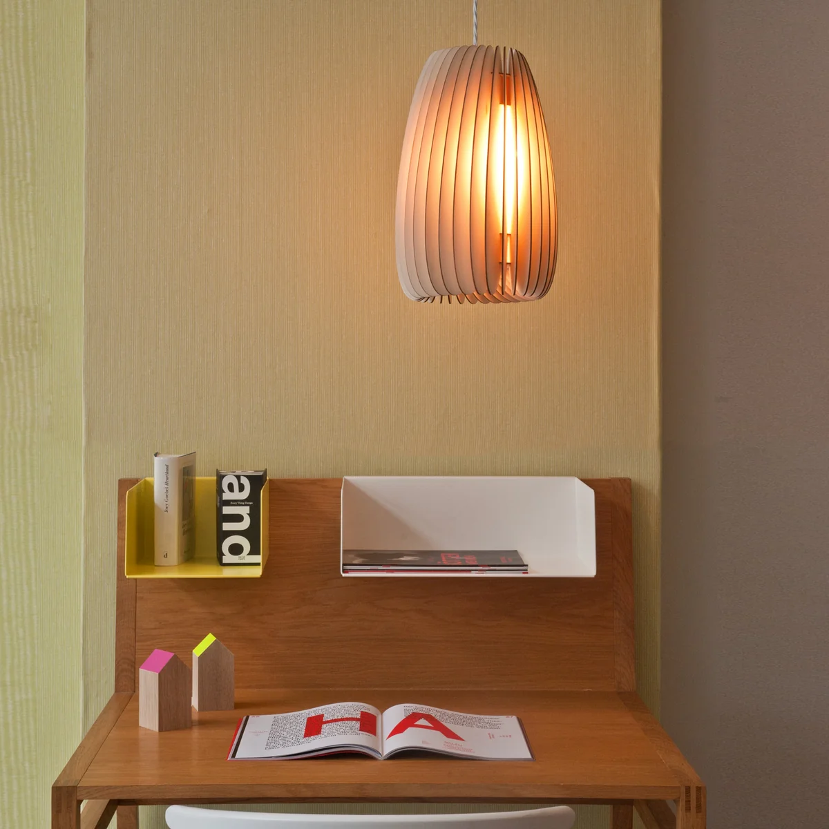 De Secundum is de tweede lamp ontworpen door Schneid. Door de hoekige houten latten is de lichtbron nooit direct zichtbaar. Op deze manier creëert de lamp een mooie en warme sfeer en garandeert verblindingsvrij licht. Secundum is de meest verkochte lamp in de A-serie van Schneid.