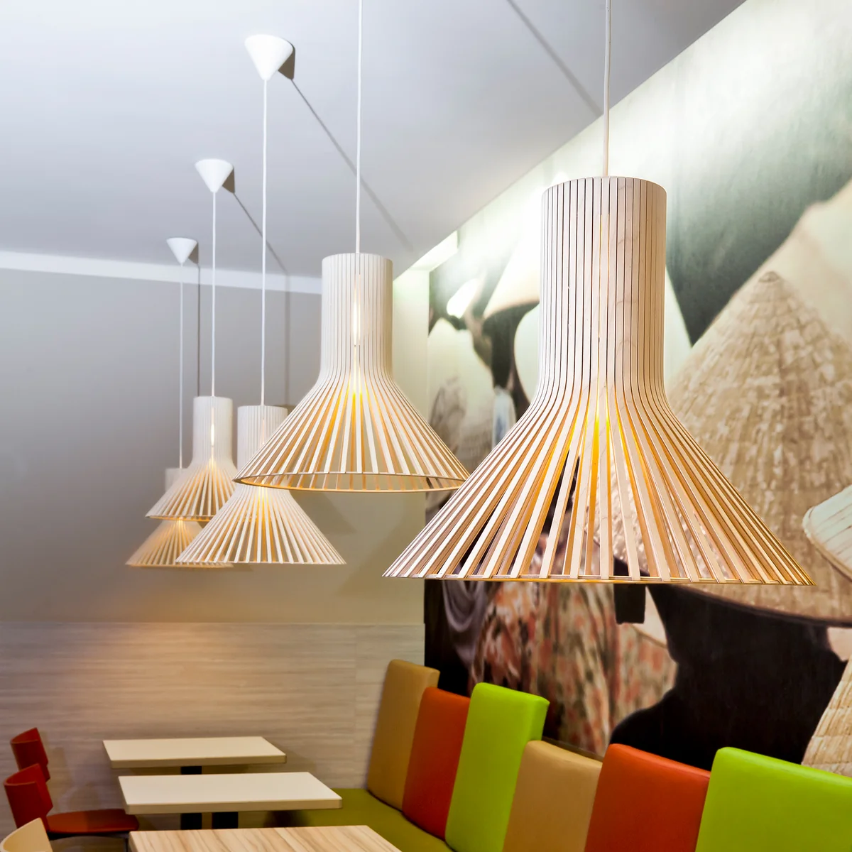 De Puncto pendelarmatuur is handgemaakt van PEFC-gecertificeerd, geperst berkenhout in Finland door gekwalificeerde Secto-medewerkers. De voorgevormde houten latten laten het licht zacht doorschijnen.