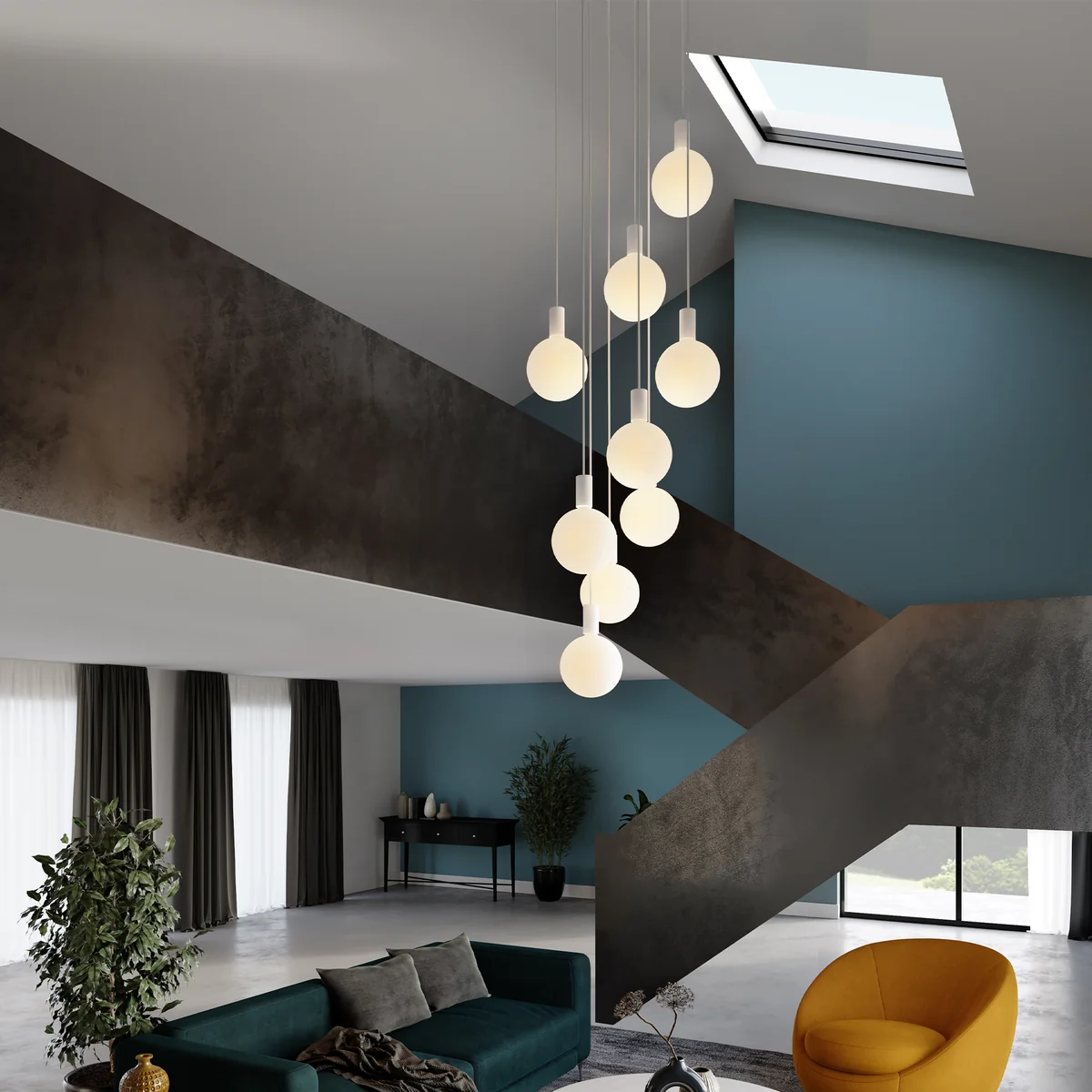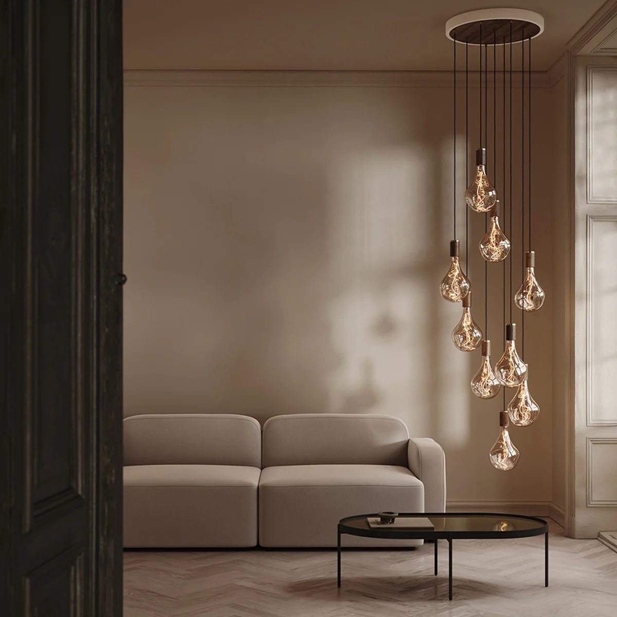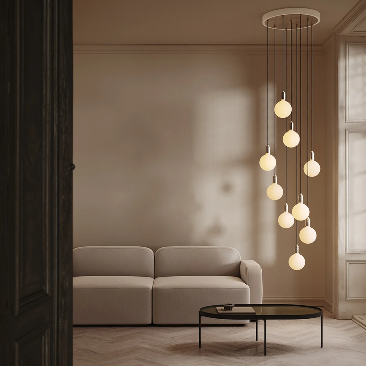 De pendelarmatuur Nine is een alles-in-één verlichtingsoplossing van Tala , die negen karakteristieke pendelarmaturen combineert met een grote plafondbaldakijn.