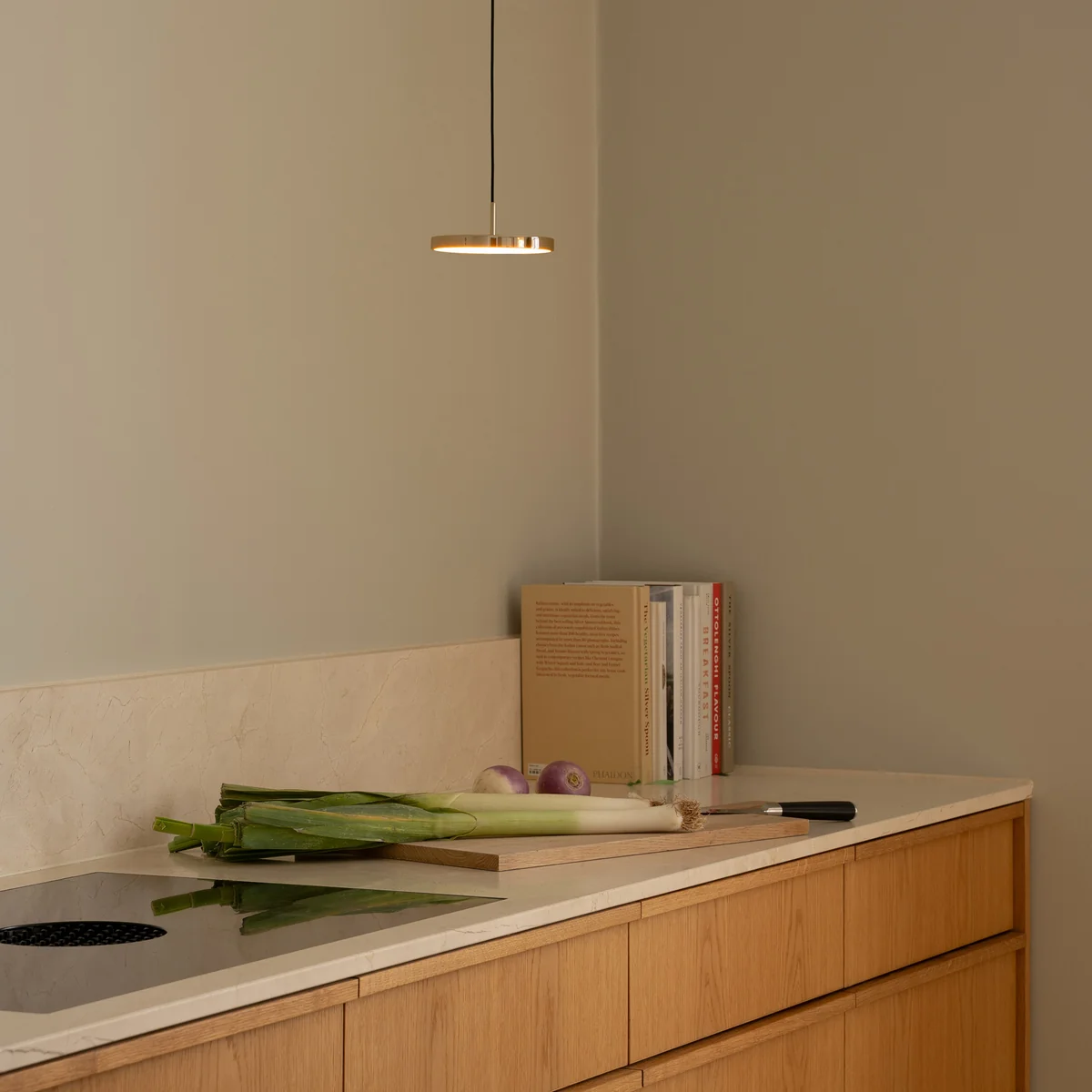 De Asteria Micro LED hanglamp, ontworpen door Søren Ravn Christensen, combineert Scandinavische eenvoud met innovatieve verlichtingstechnologie. Het ultraplatte ontwerp en de geïntegreerde LED diffuser zorgen voor een gelijkmatig, zacht licht dat perfect is voor werkoppervlakken, eethoeken of gezellige nissen. De fijne kabel en heldere lijnen geven de lamp een zwevende, elegante uitdrukking - tijdloos en ultramodern tegelijk.