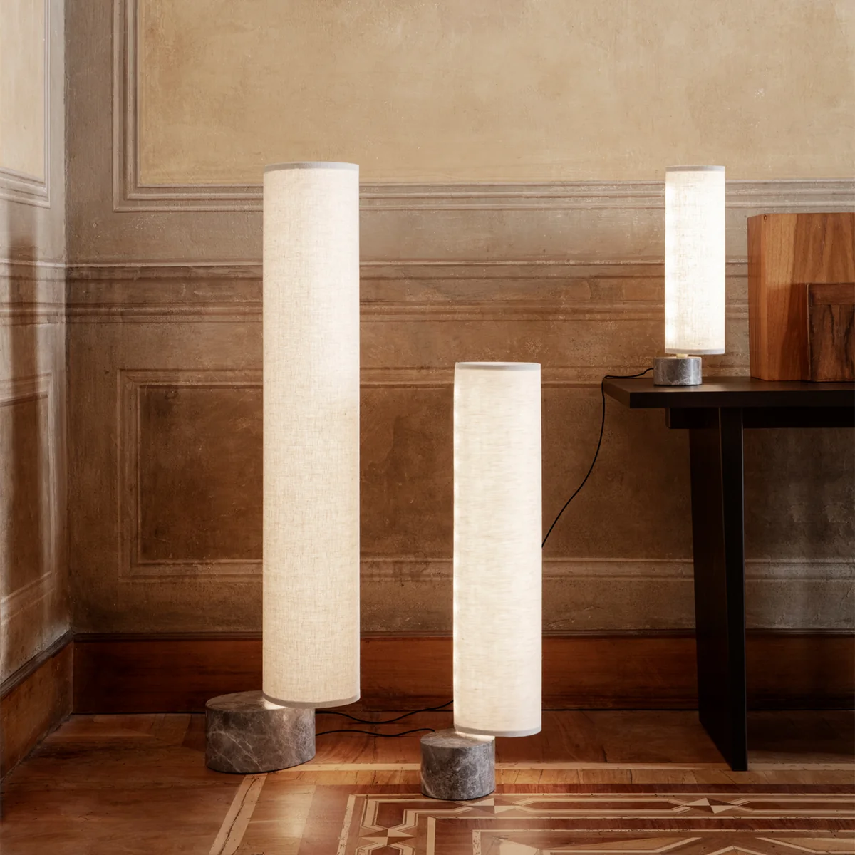 De Unbound serie van Space Copenhagen voor Gubi bestaat uit lampen van verschillende afmetingen die perfect gecombineerd kunnen worden. De voet is gemaakt van marmer, de slanke lampenkap is verkrijgbaar in zeilstof of in linnen.