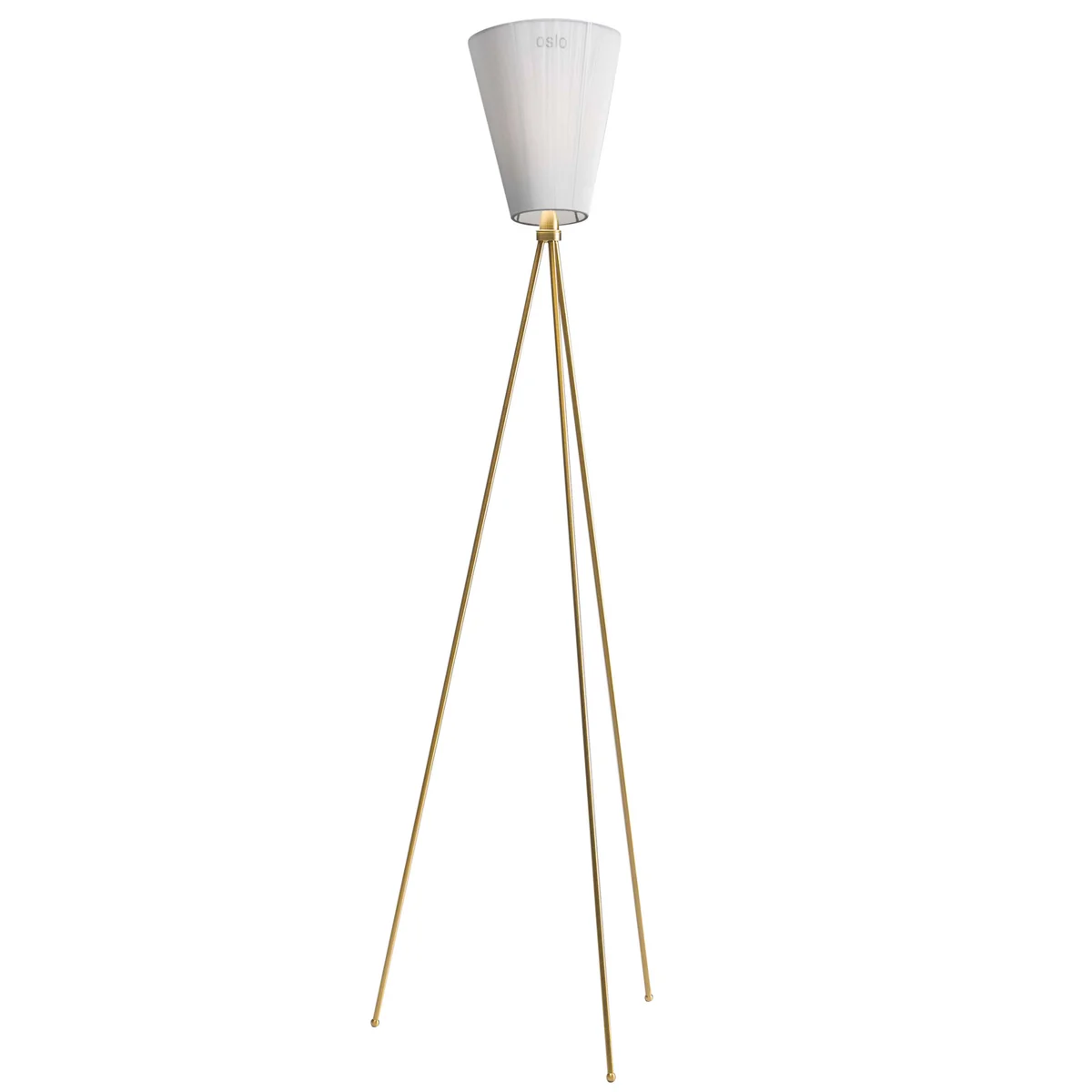 De driebenige standaard van de Oslo Wood Luminaire is gemaakt van staal, terwijl de kap is gemaakt van geplooid textiel. Beide componenten zijn verkrijgbaar in verschillende kleuren.