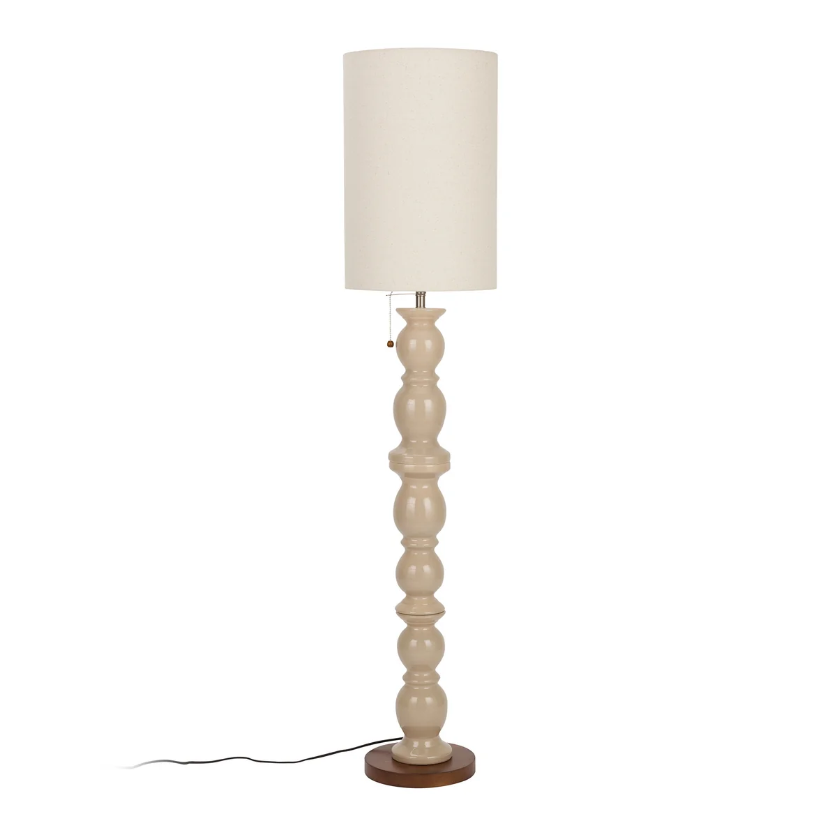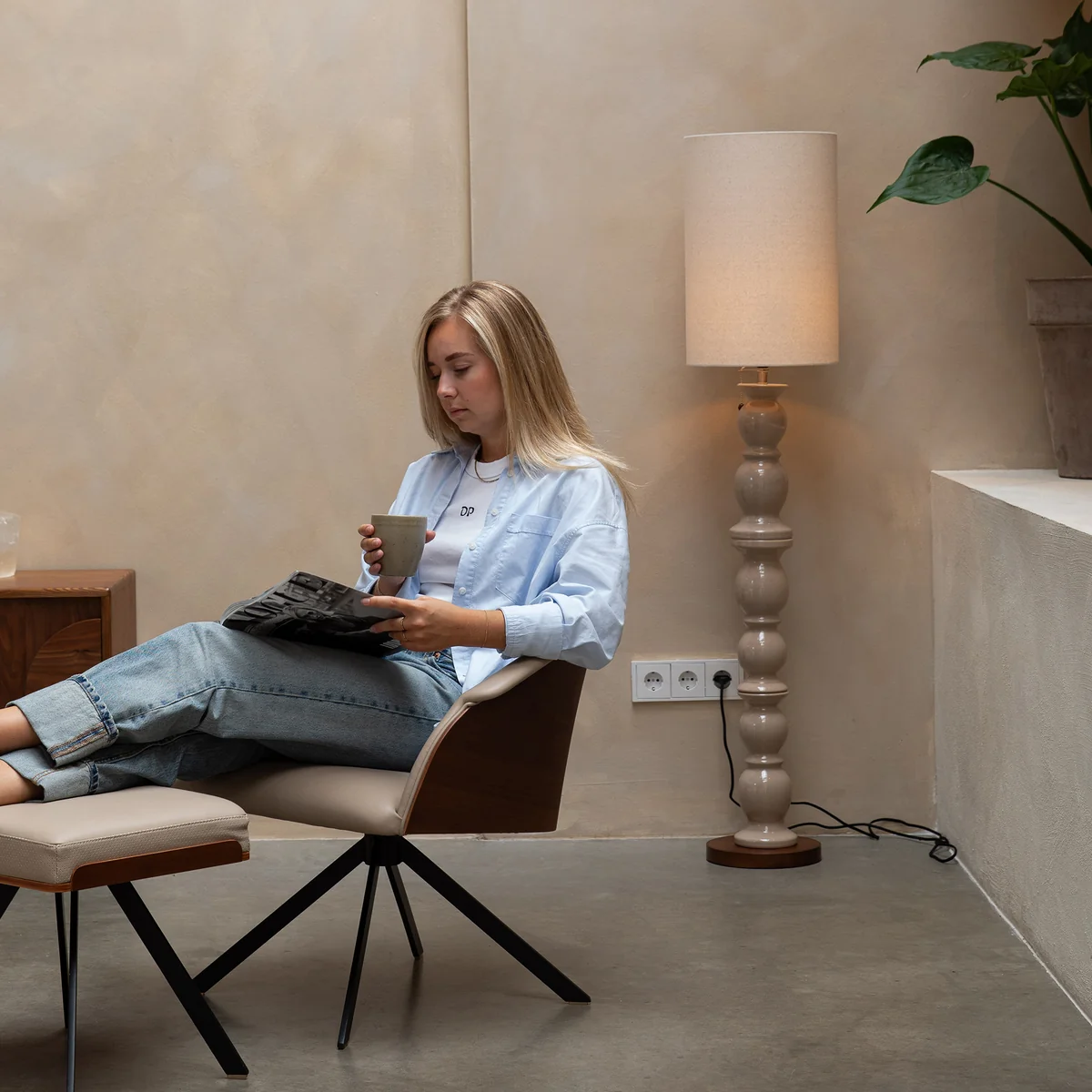 De Brew vloerlamp van Zuiver brengt gezelligheid en stijl samen in een perfecte balans. Geïnspireerd door gestapelde koffiekopjes, doen de kleur en vorm van de keramische hals denken aan het ontspannen ritueel van een vers gezette latte. In combinatie met de walnootkleurige houten voet en de eenvoudige linnen lampenkap ontstaat een warme, uitnodigende lichtbron voor elke moderne woonomgeving.