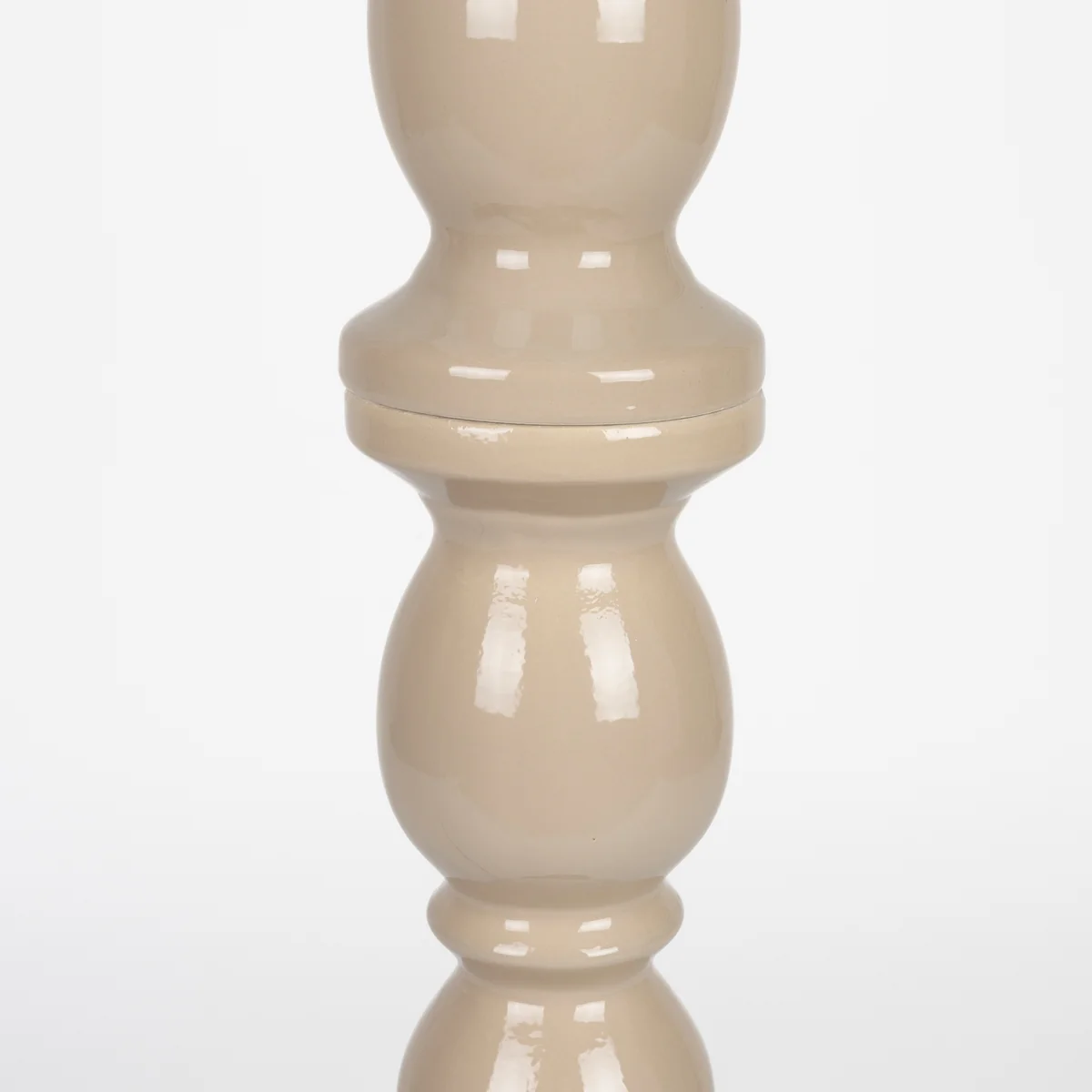 De glanzende keramische hals rust stevig op een massief walnotenhouten voet - een combinatie die warmte en elegantie uitstraalt. De kap van lichtgekleurd linnen zorgt voor aangenaam diffuus licht dat de kamer vult met een gezellige sfeer. Een bijzonder hoogtepunt: het licht kan worden in- en uitgeschakeld met behulp van een klassiek ijzeren trekkoord aan de binnenkant van de kap - een charmante herinnering aan vervlogen tijden die het ontwerp een nostalgisch karakter geeft.