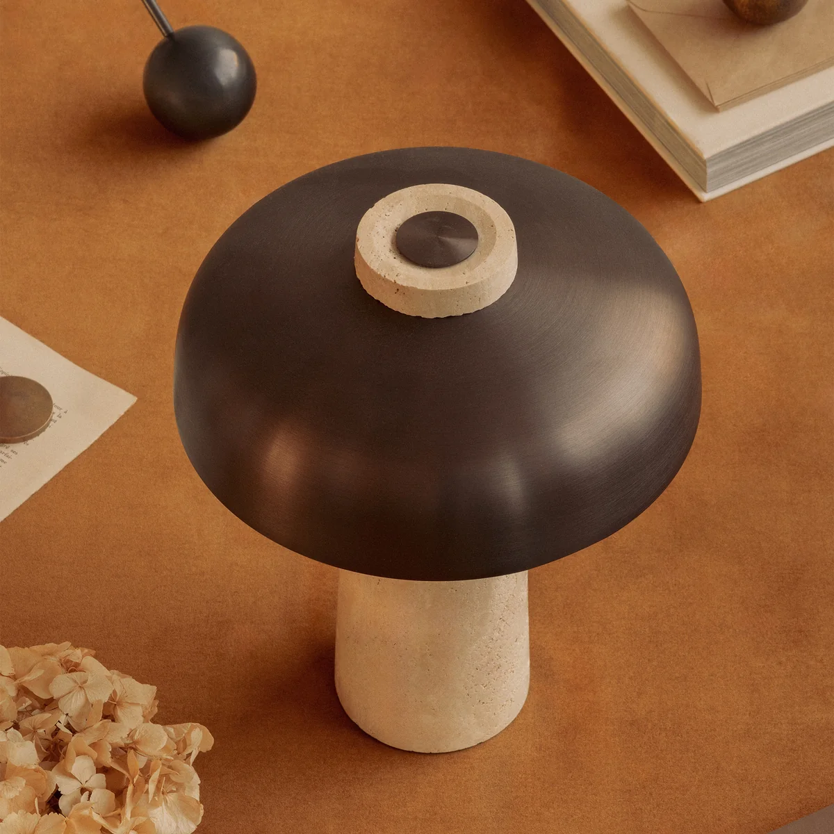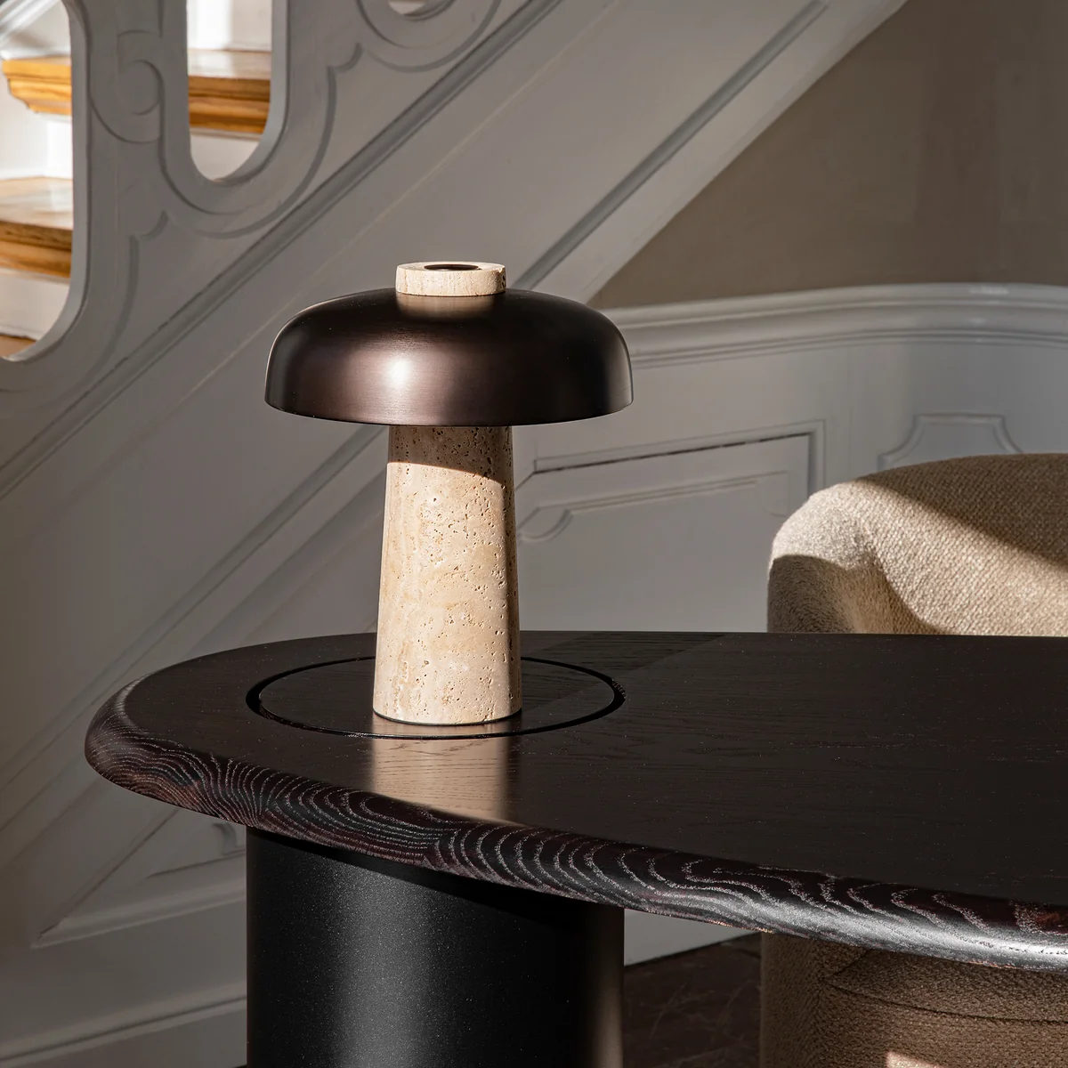De Reverse Audo tafellamp van is een ontwerp van Aleksandar Lazic en wordt gekenmerkt door de combinatie van onconventionele materialen. Terwijl de komvormige lampenkap gemaakt is van gebronsd aluminium, heeft de voet een conische vorm en is gemaakt van travertijn, een natuursteen met een fijne korrel.