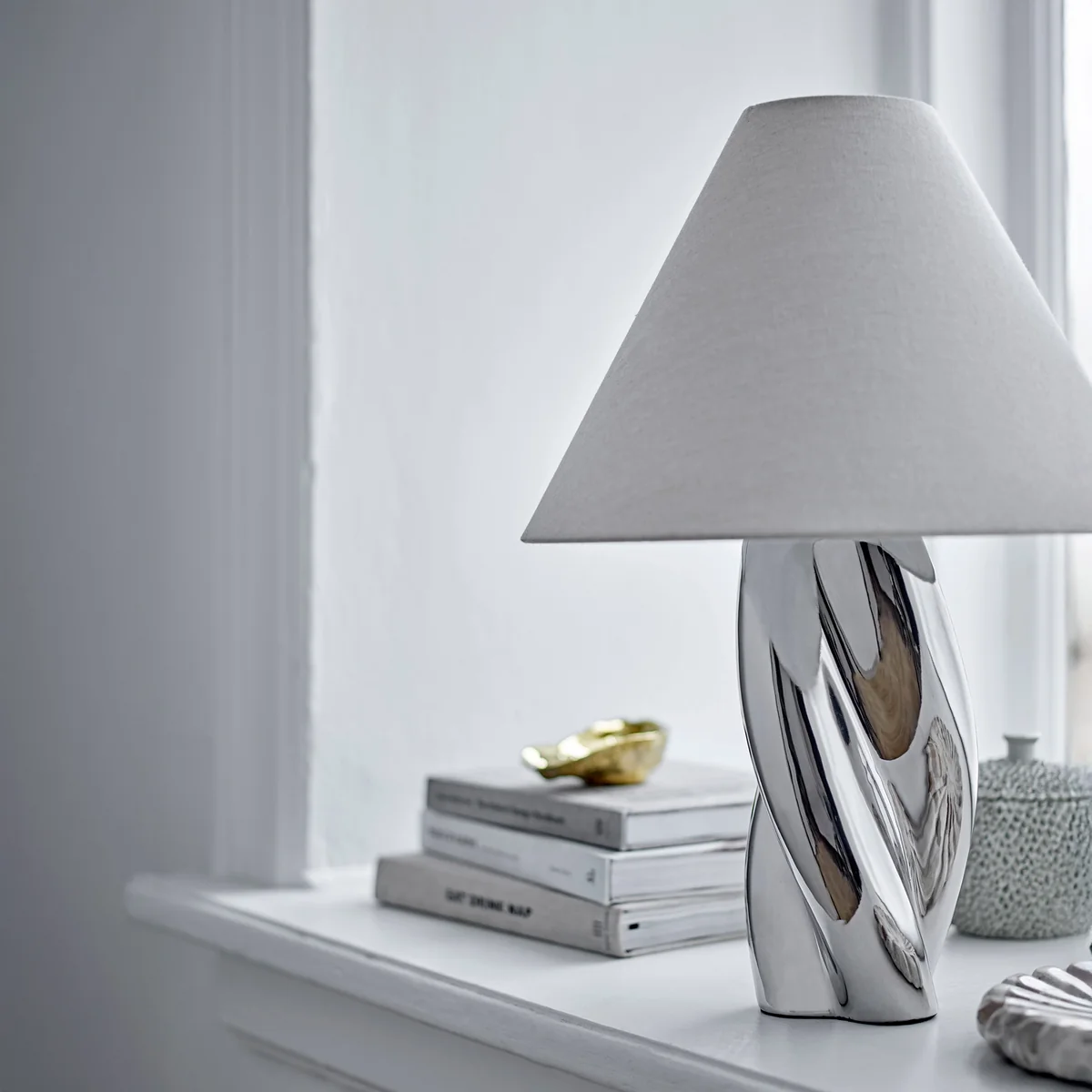 De Silva tafellamp van Bloomingville combineert een expressieve voet met een klassieke, lichtgekleurde kap. Het glanzende oppervlak ontmoet natuurlijke textuur en maakt de lamp tot een decoratief accent voor dressoirs, nachtkastjes of ladekasten.