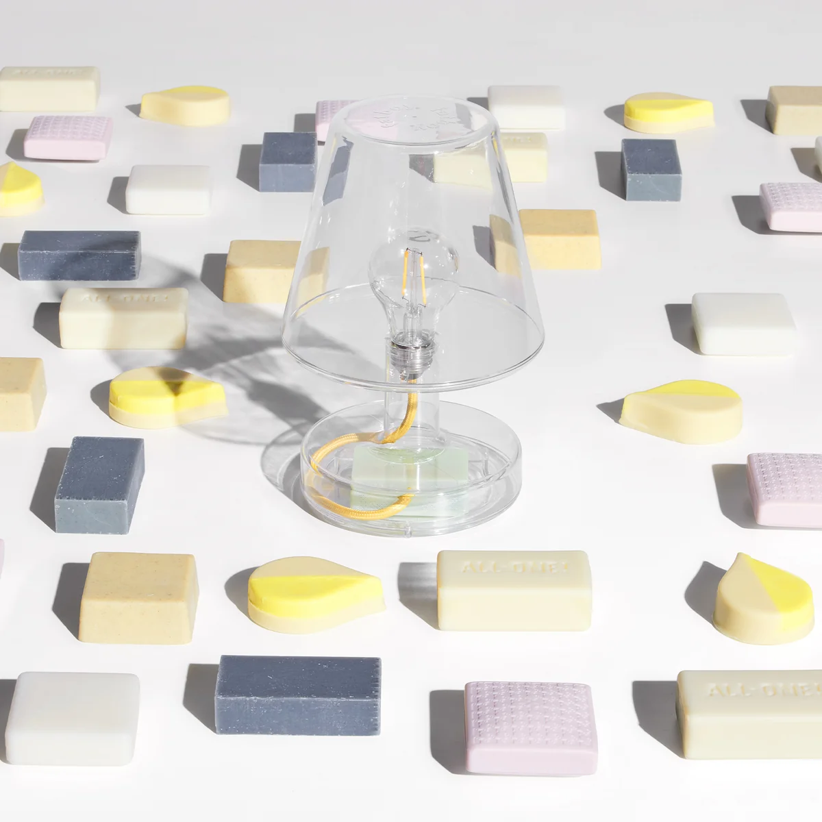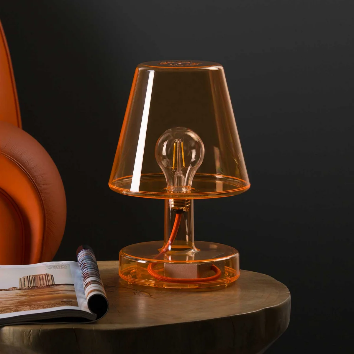 In tegenstelling tot de Edison biedt de Petit Transloetje een kijkje in zijn binnenste: de draagbare tafellamp in retrodesign toont de kijker een LED-lamp in de vorm van een traditionele gloeilamp, die via een kabel is verbonden met de oplaadbare batterij in de voet.