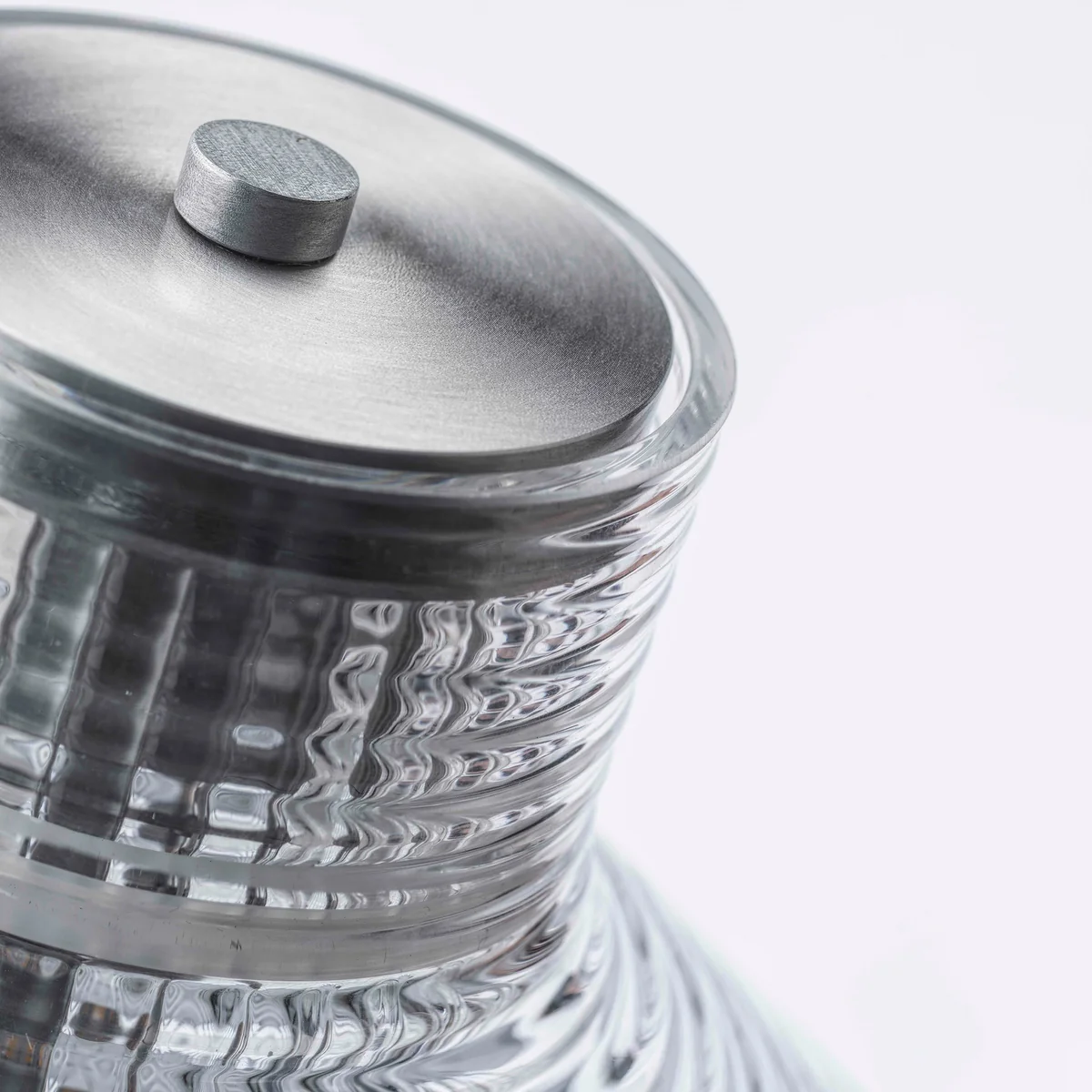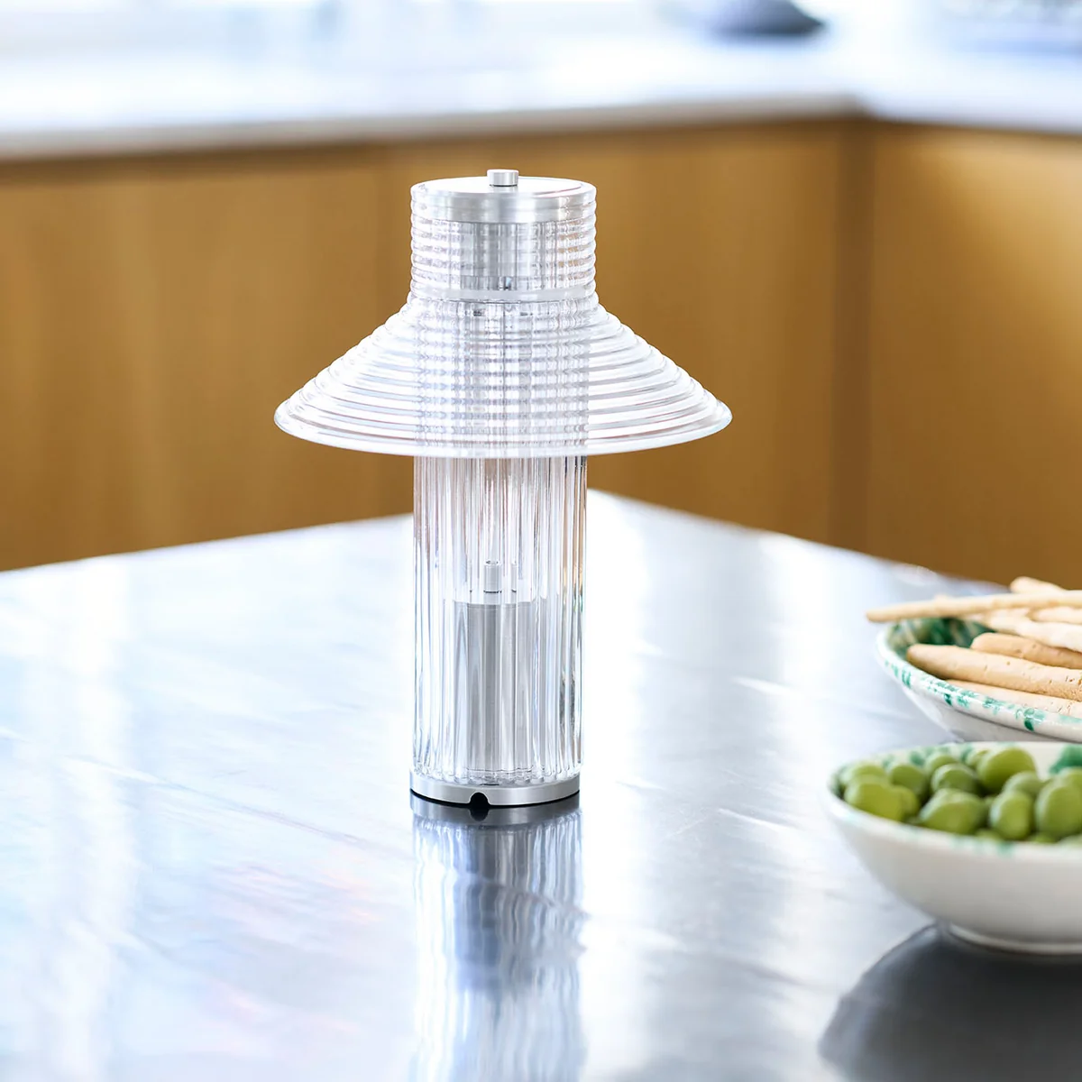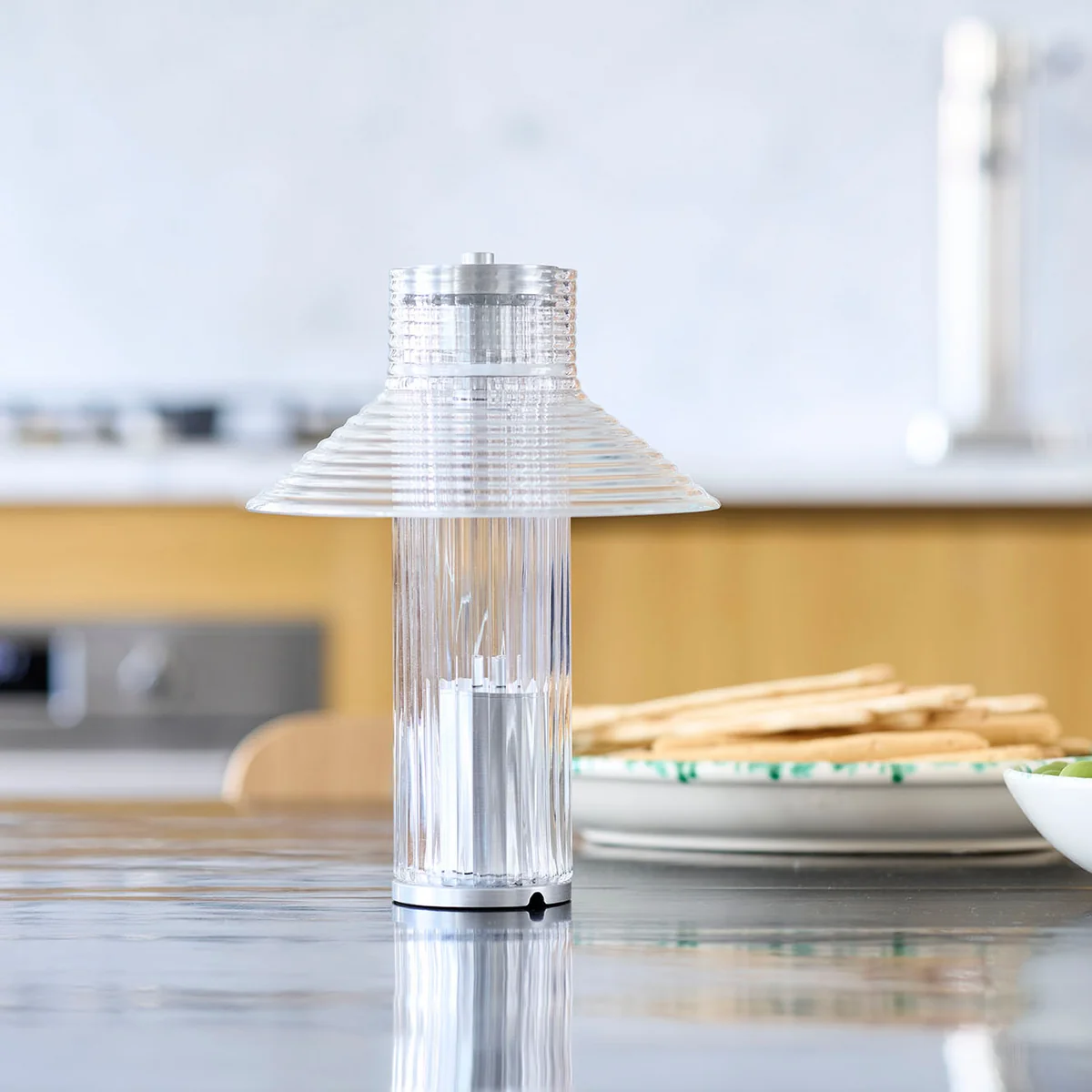 De Sletterhage tafellamp, ontworpen door Laura Bilde, maakt deel uit van de Sletterhage lampencollectie vernoemd naar de iconische Deense vuurtoren. Al tientallen jaren verlicht de Sletterhage vuurtoren de omgeving verlicht en vissers, de lokale bevolking en toeristen helpt navigeren rond de pittoreske Kaap Helgenæs in het centrum van Denemarken. Geïnspireerd door de industriële elementen van de vuurtoren, bestaat het ontwerp van de lamp uit geribbeld glas in een transparante constructie. De Deense ontwerpster Laura Bilde heeft een harmonieuze lampenfamilie gecreëerd door handig gebruik te maken van dezelfde glazen onderdelen in verschillende variaties.