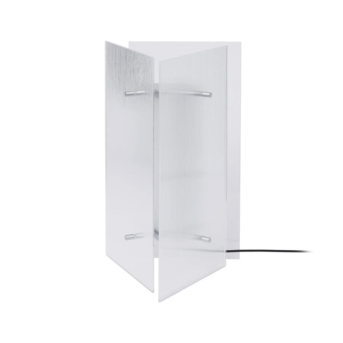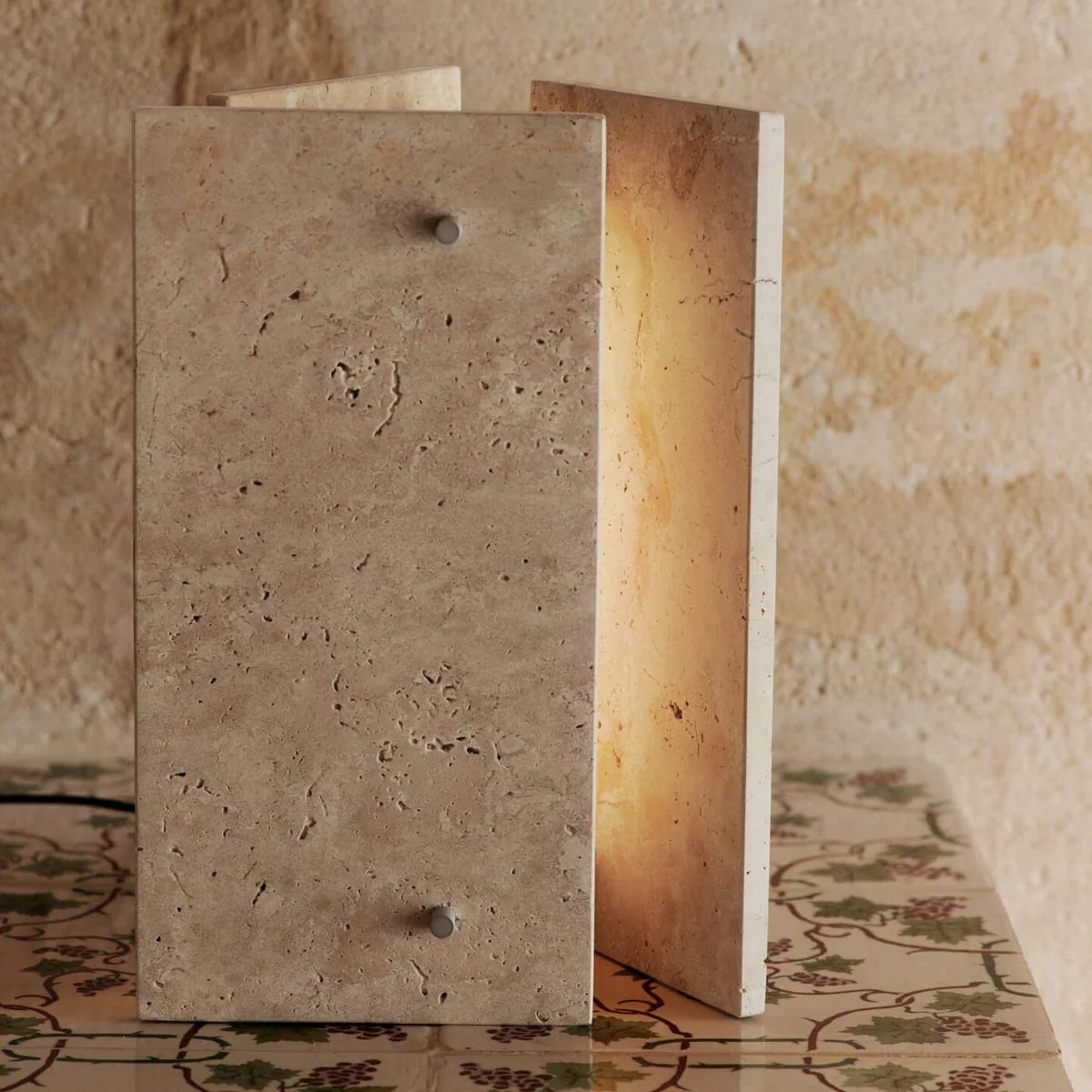 Drie travertijnen panelen omringen de centrale lichtbron en creëren een fascinerend spel van licht en schaduw. De natuurlijke structuur van de steen versterkt het warme, diffuse licht en creëert een zachte, architecturale sfeer. De armatuur wordt plat verpakt geleverd, is eenvoudig te installeren en heeft een geïntegreerde dimfunctie. Het combineert materialiteit met functionaliteit en biedt een stijlvolle verlichtingsoplossing voor elke ruimte.