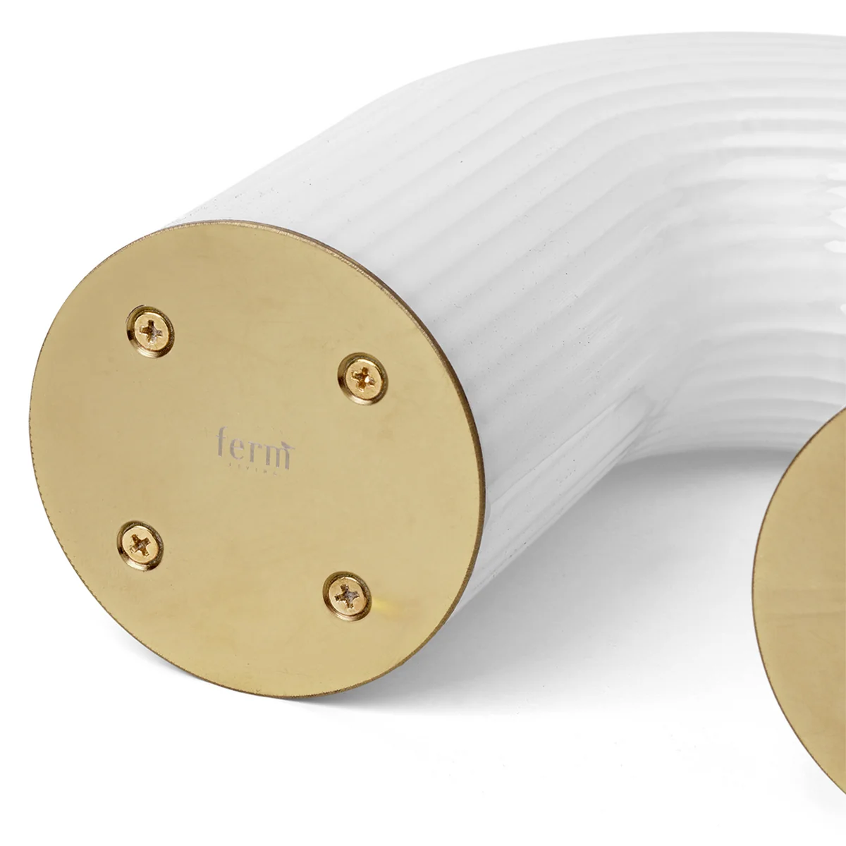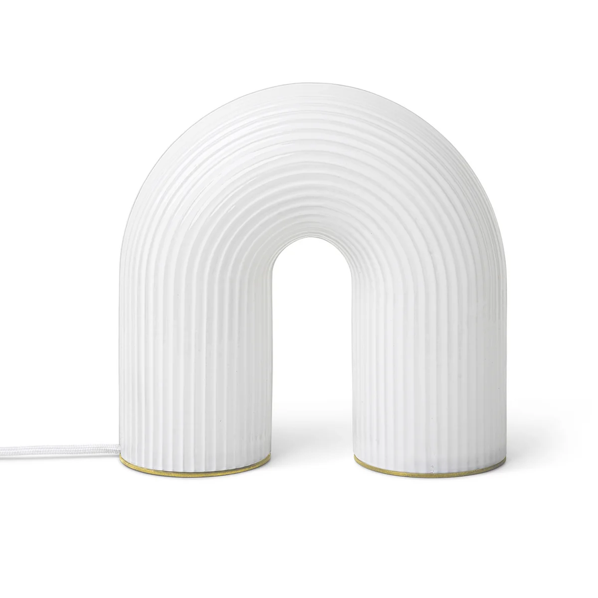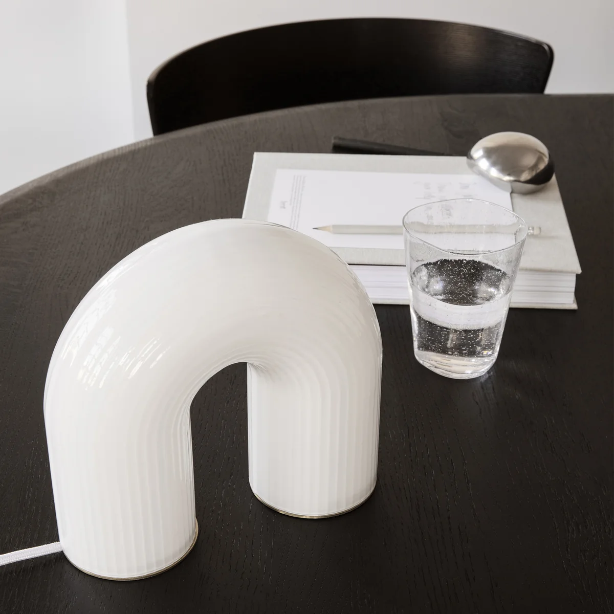 De Vuelta Tafellamp van Ferm Living kenmerkt zich door zijn unieke vorm, waardoor de lamp bij uitschakeling niet direct als zodanig herkenbaar is. Het silhouet van de tafellamp lijkt op een boog en doet denken aan antieke sculpturale zuilen. Vervaardigd is de Vuelta Tafellamp van geribbeld opaalglas, die zorgt voor een extravagant spel van licht en schaduw.