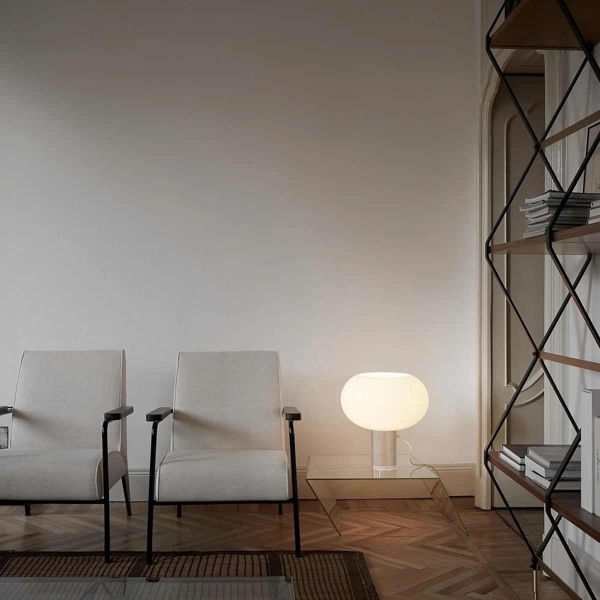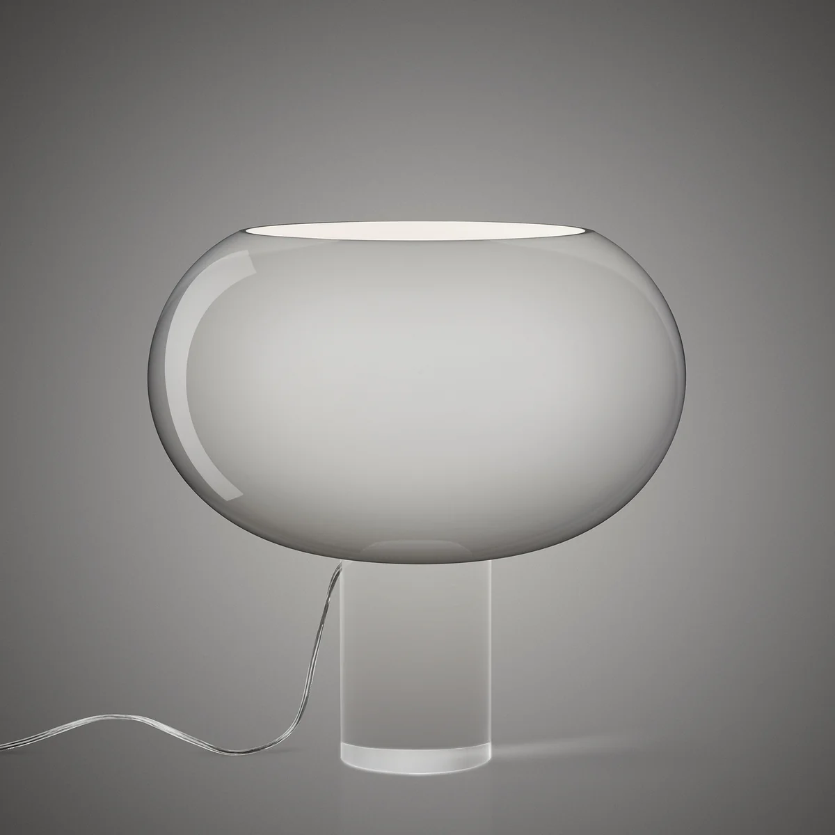 De diffusor rustend op een transparante, cilindervormige voet van kunststof, zorgt ervoor dat de lamp er bijna gewichtloos uitziet. Hierdoor ontstaat een vorm die eenvoud en zuiverheid uitstraalt en de lamp een fraai uiterlijk geeft.