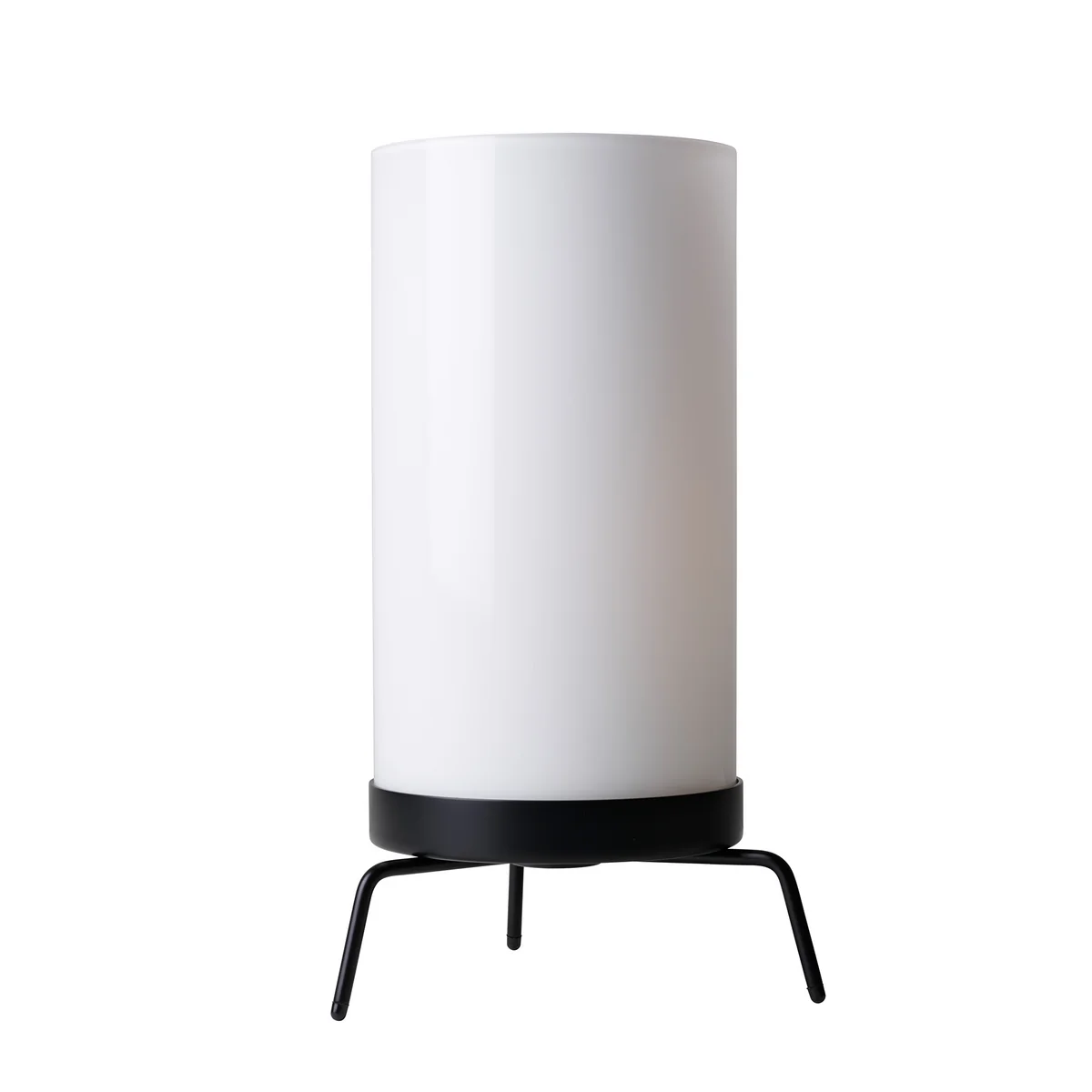 De armatuur bestaat uit een met de hand geblazen gematteerd glas dat indirect, sfeervol en warm licht geeft. Het driepootonderstel is gemaakt van gepoedercoat staal of glanzend messing en vormt een elegant contrast met de hoge, cilindrische kap.