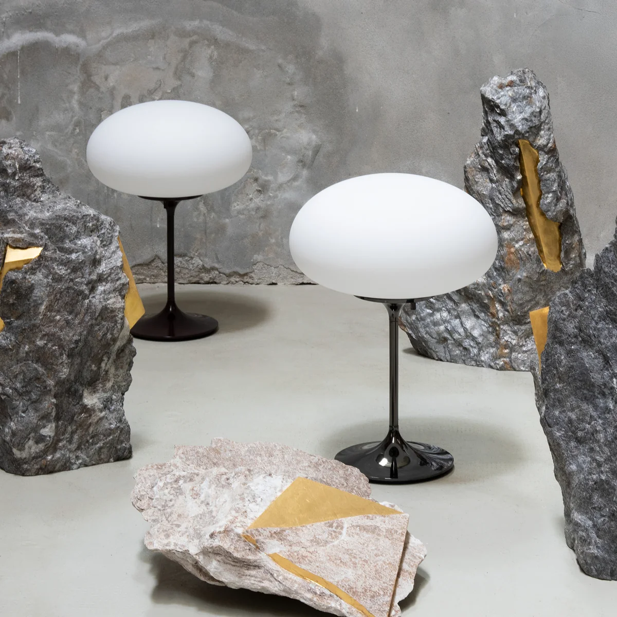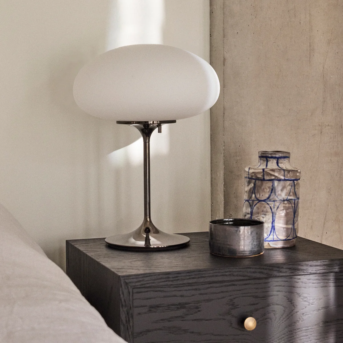 Met zijn hoogte van 42 cm is de Stemlite tafellamp ideaal voor dressoirs, nachtkastjes of bureaus. De opalen glazen behuizing zorgt voor een zacht, gelijkmatig verspreid licht, terwijl de organische vorm een tijdloze balans creëert tussen futuristische elegantie en gezellige warmte.