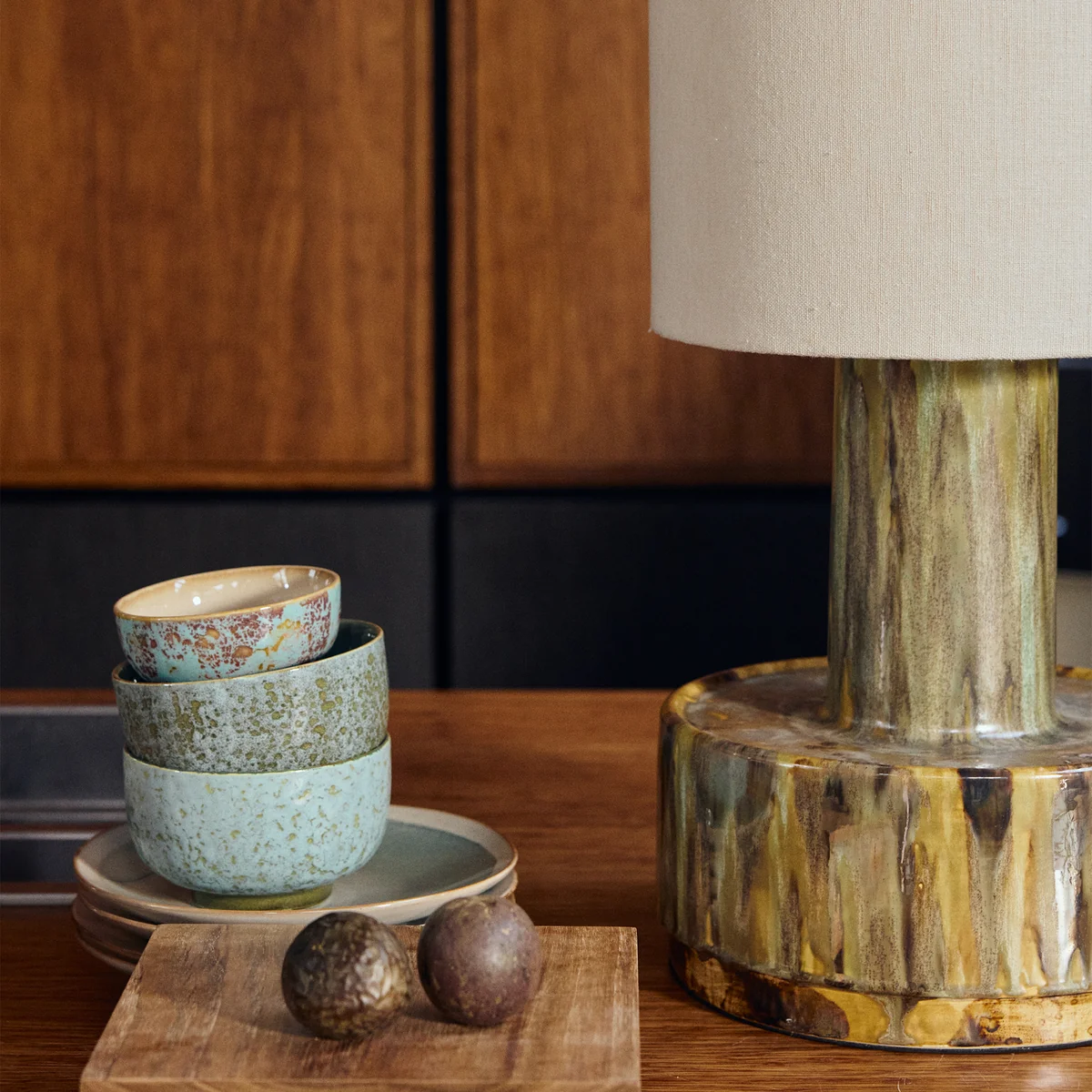 Dankzij een reactief glazuur vertoont elk stuk een uniek, onvoorspelbaar patroon dat elke lamp uniek maakt. Deze lampenvoet is meer dan alleen een functioneel element - hij voegt karakter en diepte toe aan het interieur en geeft de kamer een persoonlijk tintje.