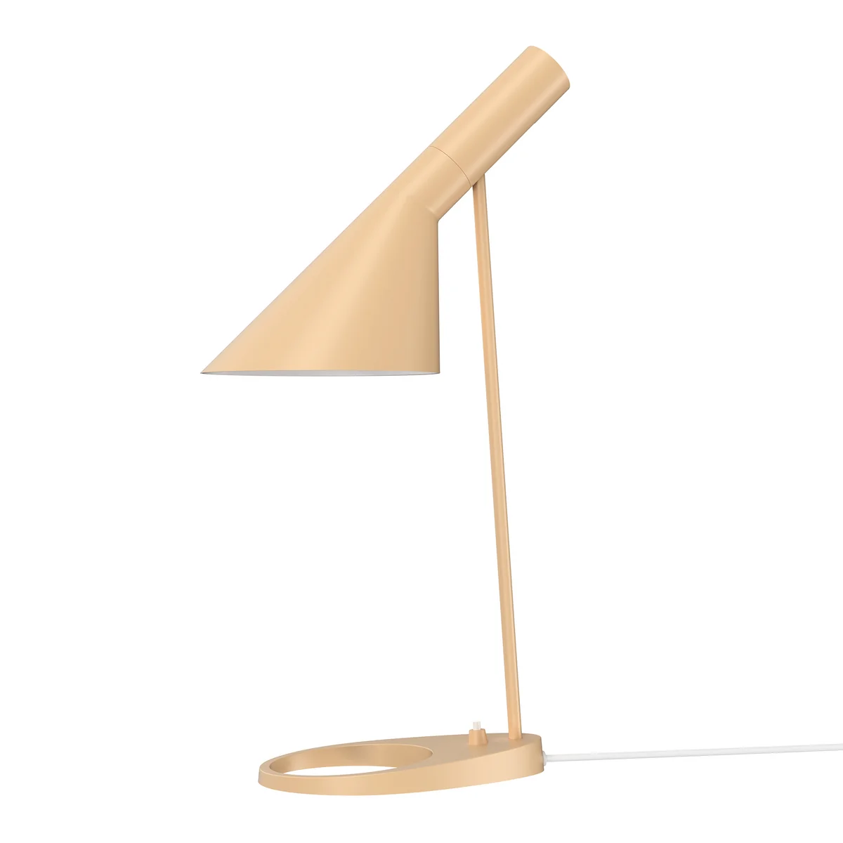 De AJ tafellamp is gebaseerd op dezelfde principes als de AJ vloerlamp, maar de kap is vergroot voor een beter gebruik als werklamp. De hoek van de conische metalen kap is ontworpen om overeen te komen met de hoek van de lamphouder. Tenminste, zo was het oorspronkelijk bedoeld, maar in werkelijkheid is de hoek enigszins aangepast als optische correctie. Als de lamp naar beneden is gekanteld, is de rand van de lamphouder horizontaal. De binnenkant van de kap is mat wit geëmailleerd. De kap is efficiënt, je kunt niet in de lichtbron kijken.