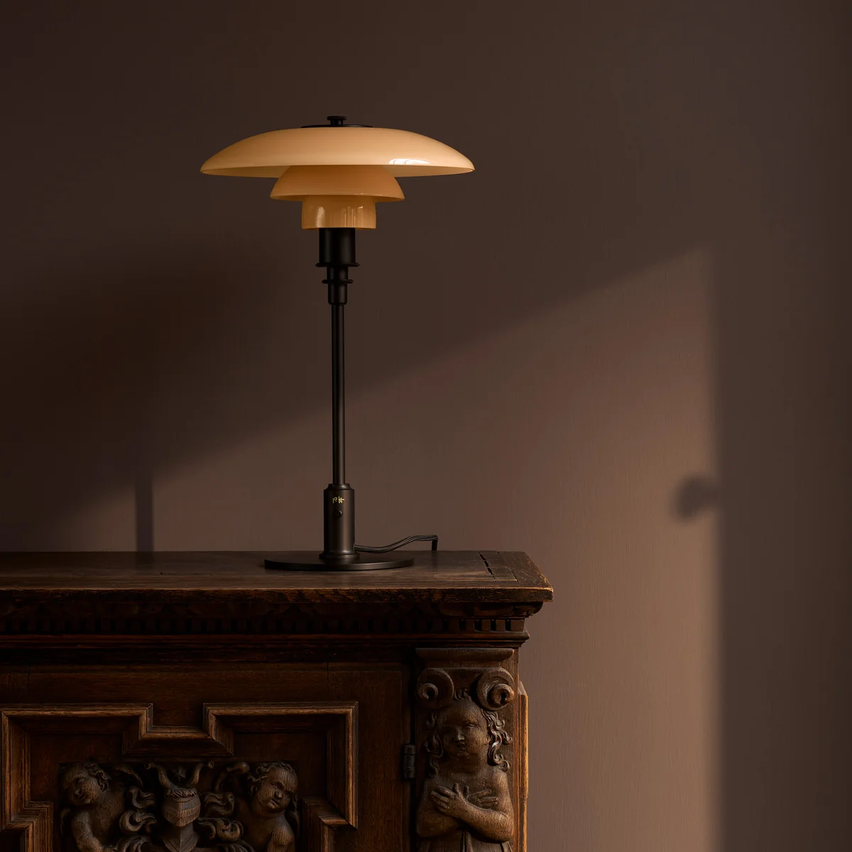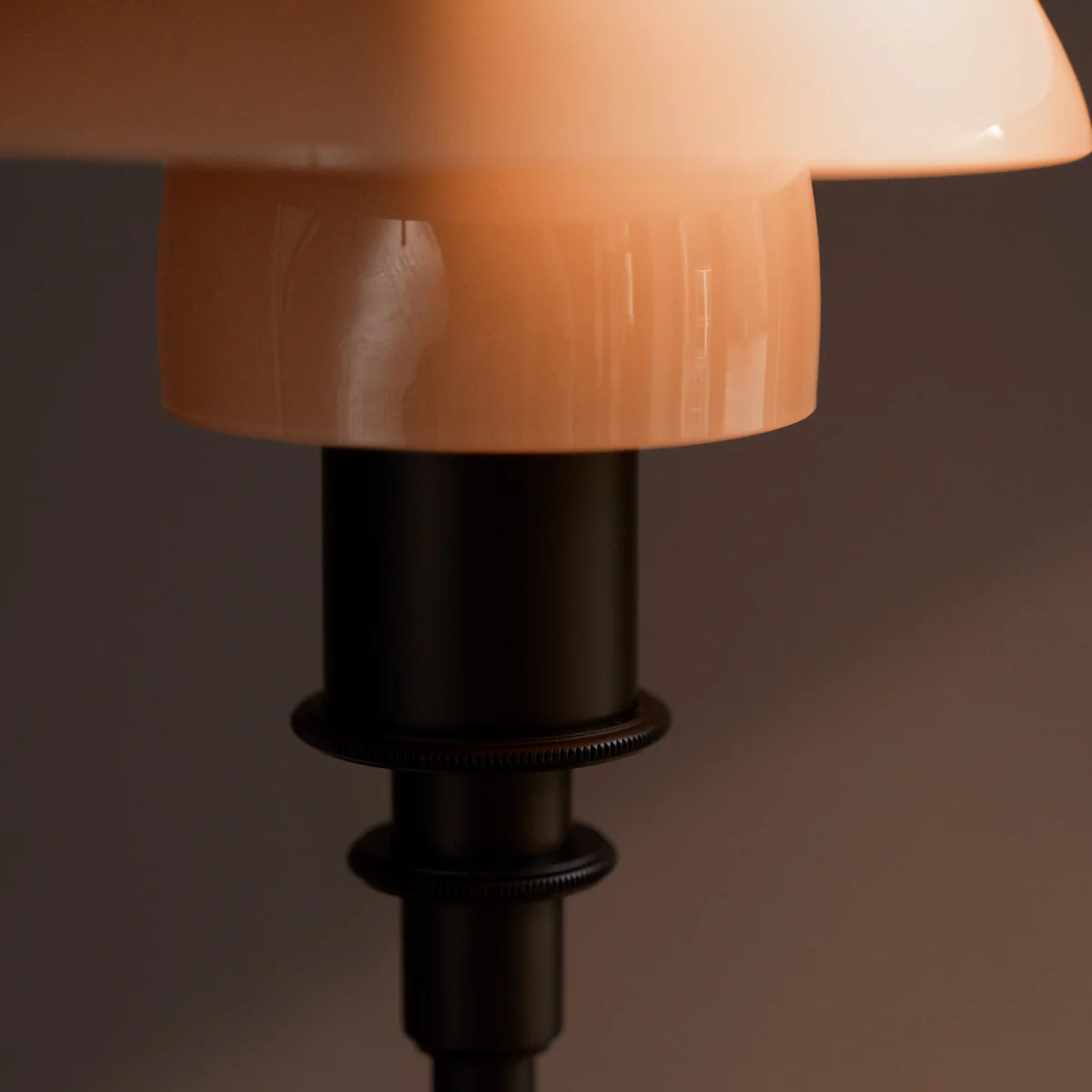 De PH 3/2 Dusty Terracotta Tafellamp - Limited Edition 2025 brengt het klassieke 3-kappenontwerp van Poul Henningsen op tafel in een nieuw, warm kleurenschema. De body van de lamp is gemaakt van mondgeblazen, vierlaags glas in een rijke terracotta kleur met een gezandstraalde witte onderkant. Het geheel wordt gecompleteerd door geborsteld, verouderd messing met fijne haarlijnen en geraffineerde details zoals de metalen doorgeefschakelaar, de donkere textielen kabel en de discreet gegraveerde PH initialen.