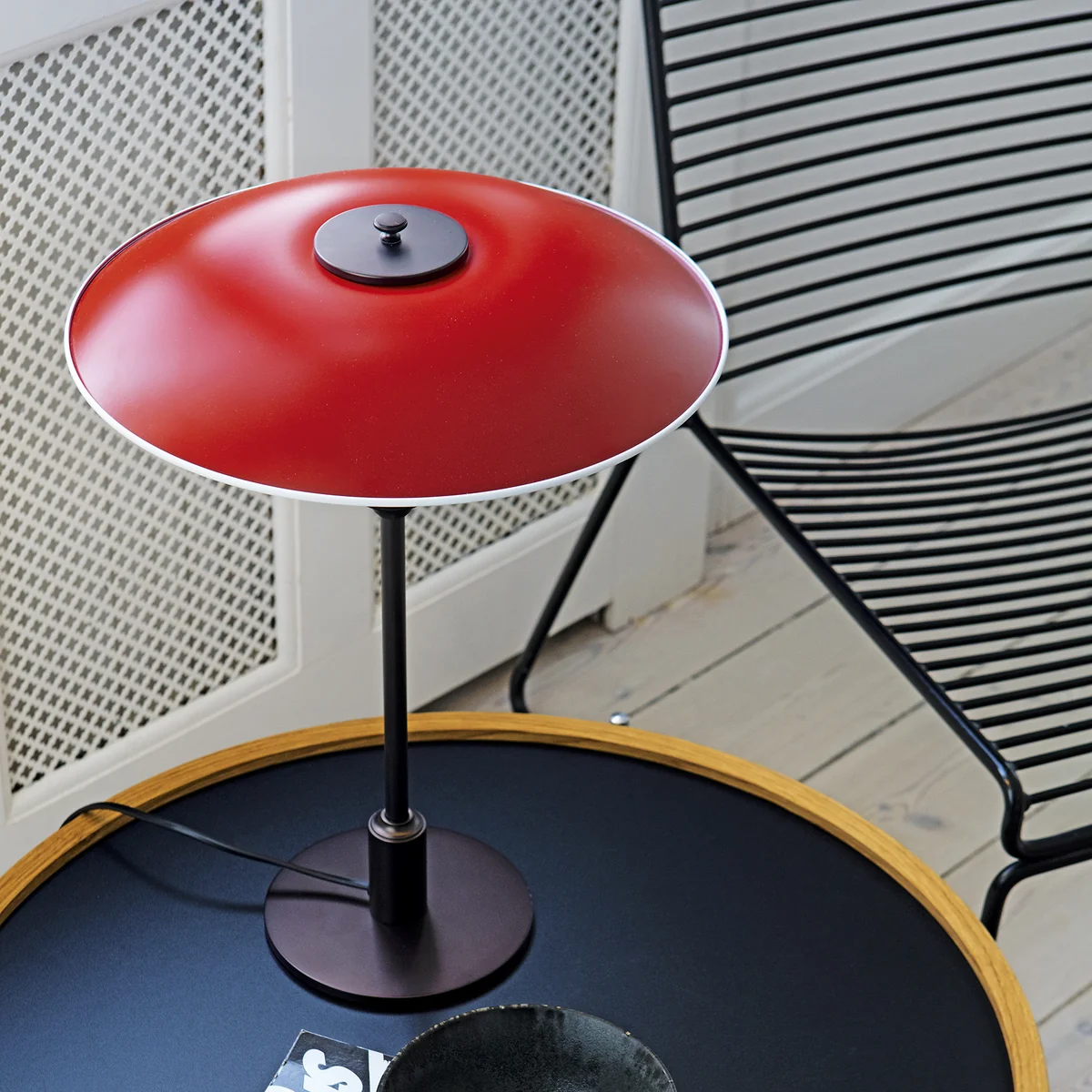 De kleine tafellamp PH 3½-2½ is ontworpen op basis van het principe van een reflecterend driekleurensysteem dat het licht grotendeels naar beneden richt.
