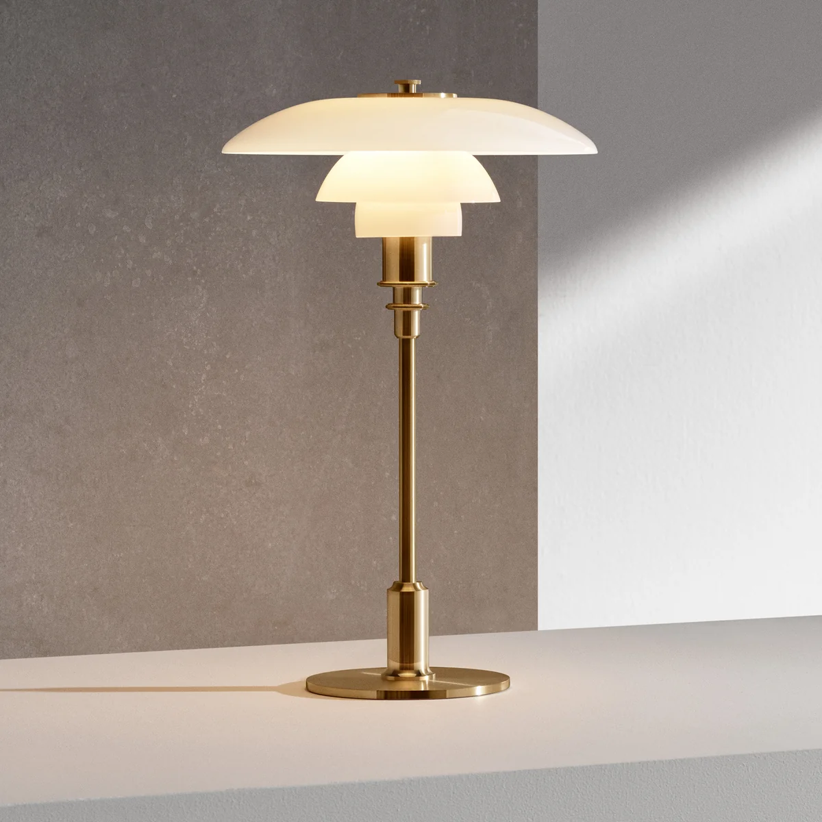 De wit gelakte binnenkant van het bovenste scherm leidt het licht zachtjes naar beneden. De twee onderste opaalglazen schermen bieden een groot, verblindingsvrij oppervlak. Dit maakt optimaal gebruik van de lichtbron om een behaaglijk en functioneel licht te creëren.