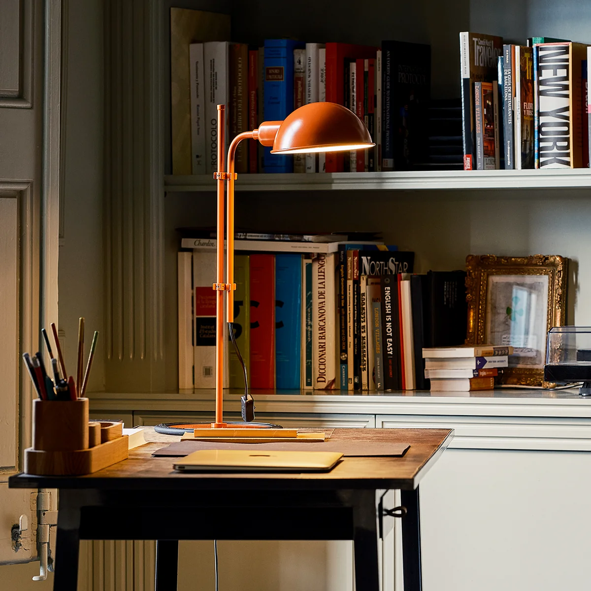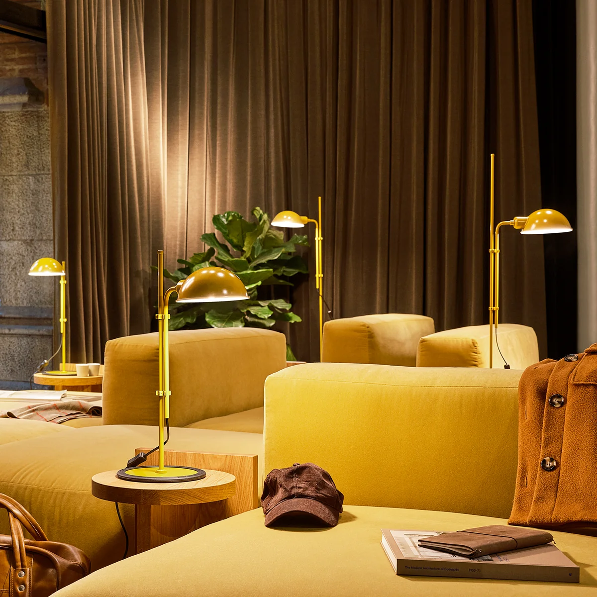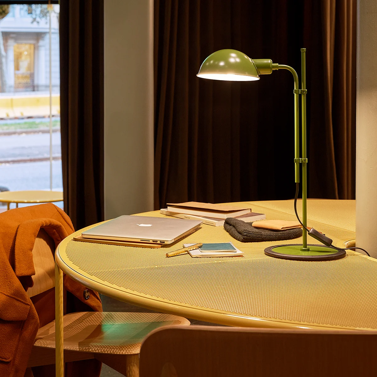 De schaduw van de Funiculí tafellamp kan omhoog of omlaag worden bewogen met klemmen op de as. Op die manier kan de gewenste hoogte individueel worden ingesteld. Met de diffuser kan de kap 360 graden worden gedraaid, zodat het licht naar behoefte kan worden gericht. Het rubber aan de onderkant van de Funiculí Het rubber op de voet van de tafellamp zorgt ervoor dat het metaal van de lamp het oppervlak waarop hij staat niet beschadigt. Het zorgt ook voor meer stabiliteit.