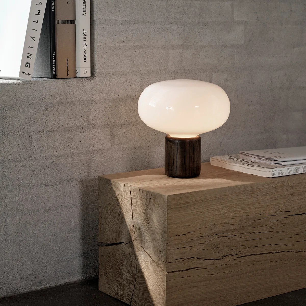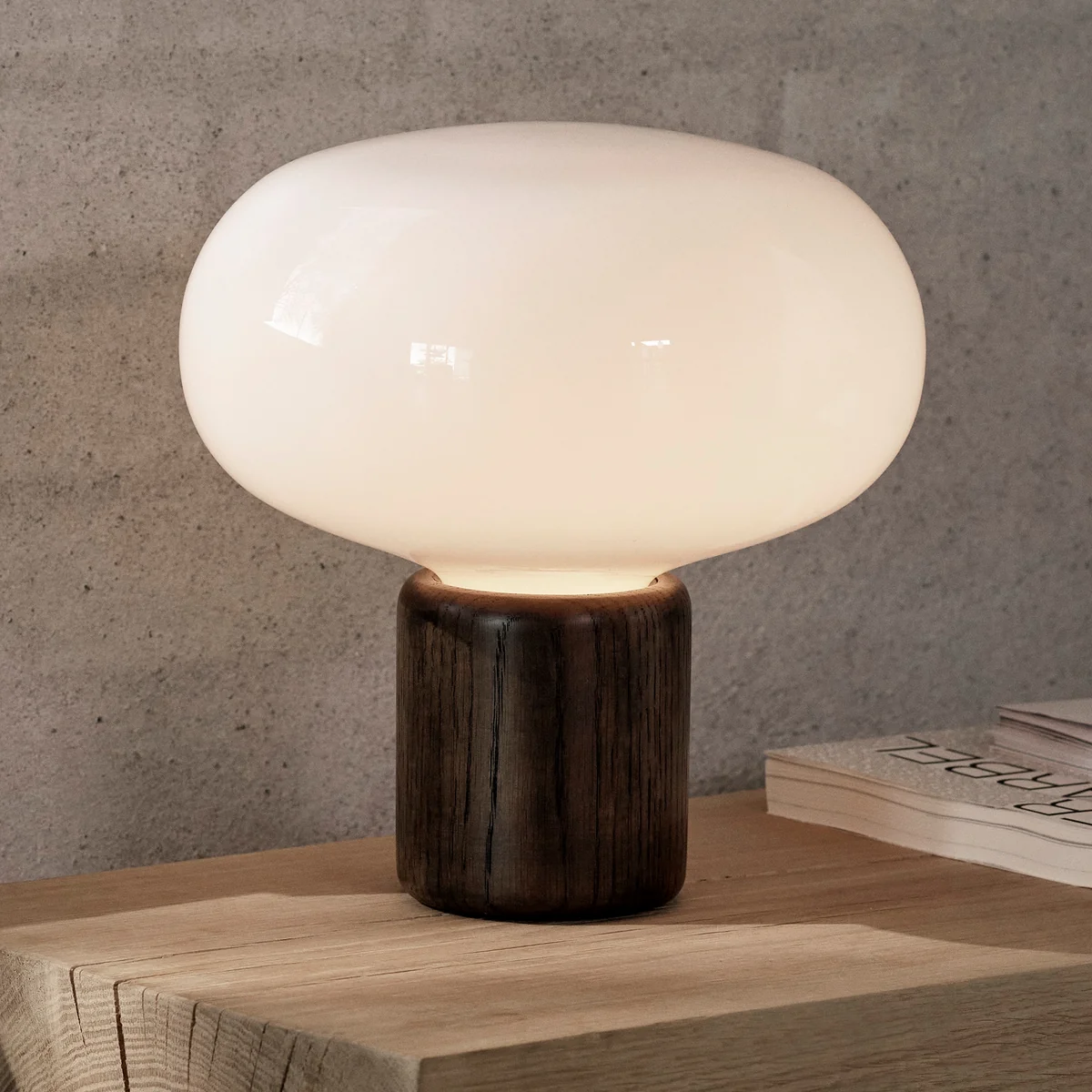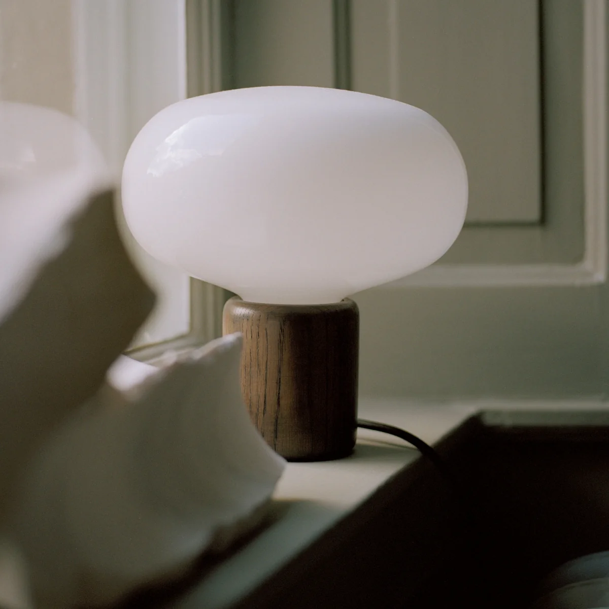 New Works De Karl-Johan tafellamp van is een prachtige combinatie van natuurlijke inspiratie en tijdloos design. Geïnspireerd door herfstwandelingen en de zoektocht naar wilde paddenstoelen, belichaamt deze lamp de zachte tinten en rustige sfeer van een herfstbos. Het harmonieuze ontwerp combineert de zachte rondingen van glas met de robuuste stabiliteit van gerookt eikenhout. Het resultaat is een poëtisch meesterwerk dat de balans tussen kleur en textuur, duisternis en licht perfect weergeeft. De Karl-Johan tafellamp brengt niet alleen elegantie, maar ook een rustgevende en warme sfeer in elk huis.
