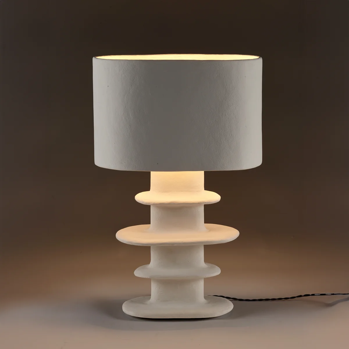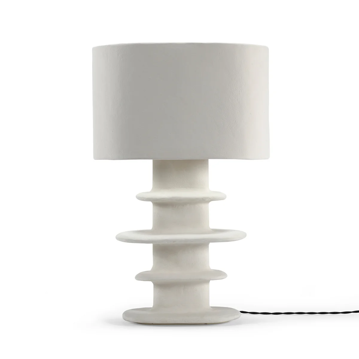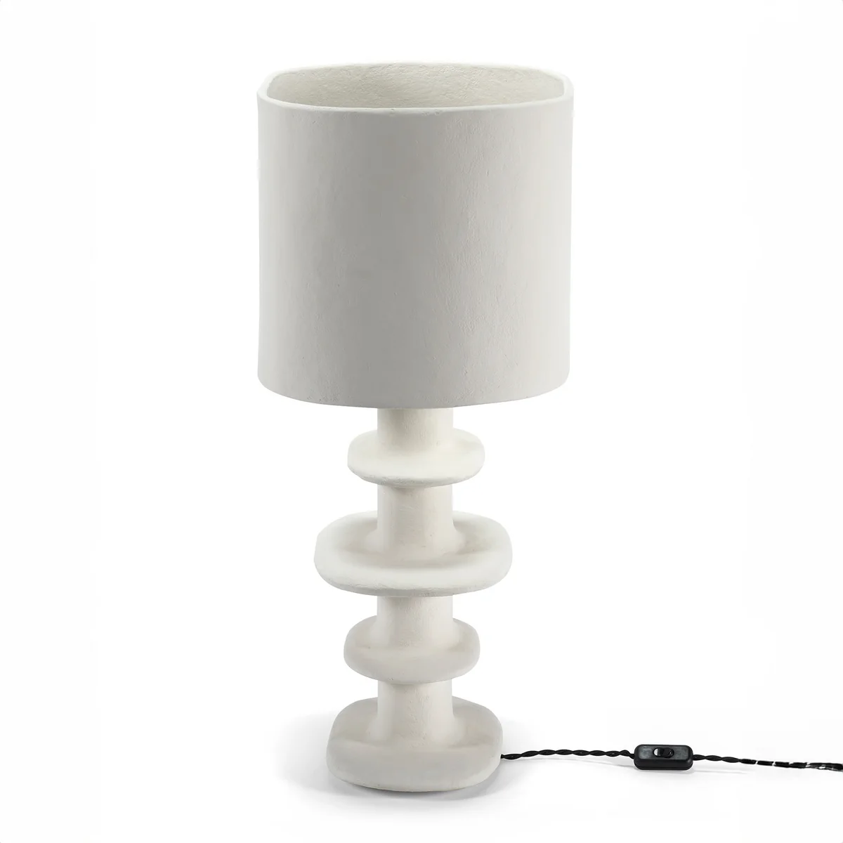 Earth Serax De Geometric tafellamp van, ontworpen door Marie Michielssen, vangt het licht op een fascinerende manier. De sculpturale voet van wit papier-maché, die doet denken aan de iconische Billy vazen, zorgt voor een opvallend accent. De organische vorm en zachte textuur van het materiaal creëren een warme en uitnodigende sfeer.
