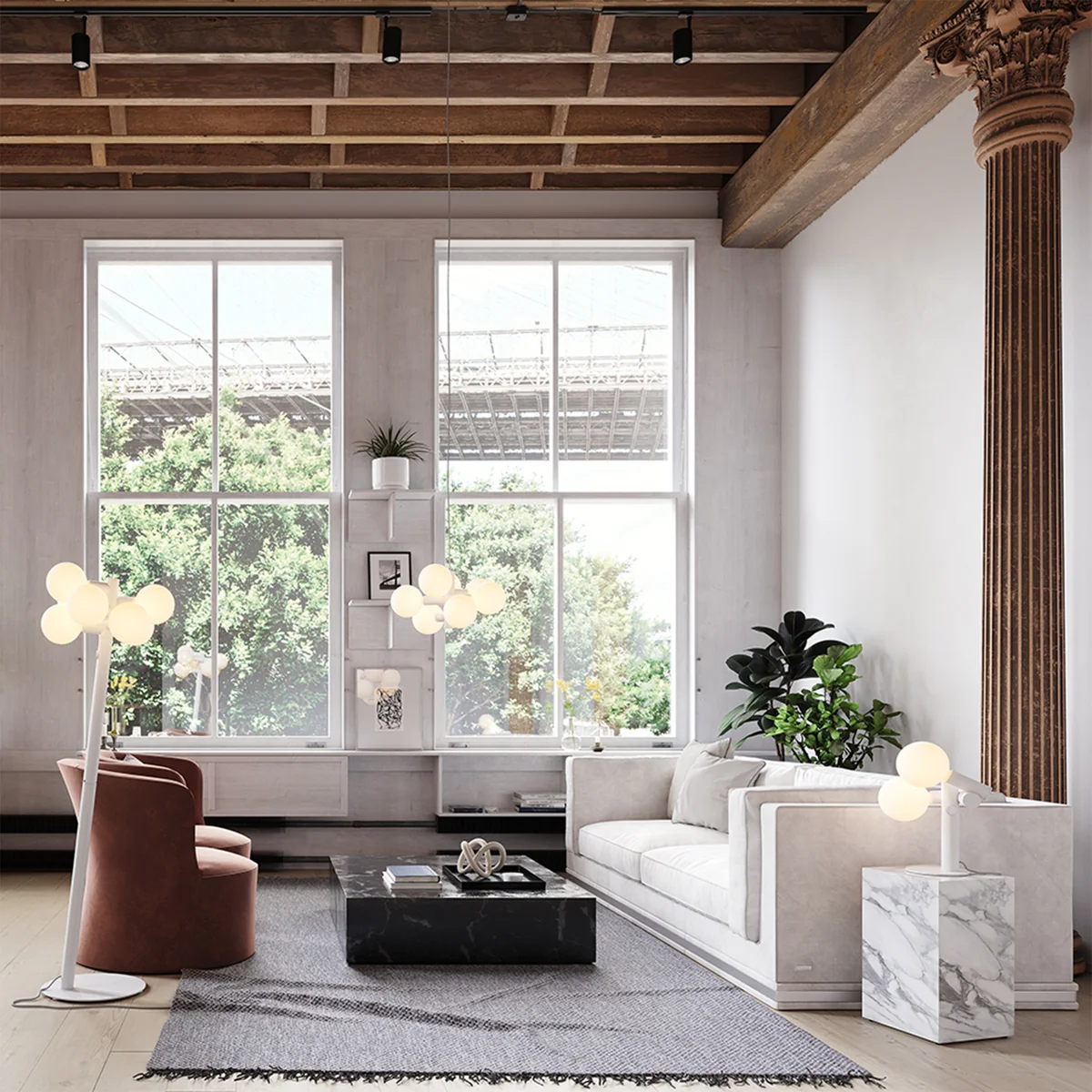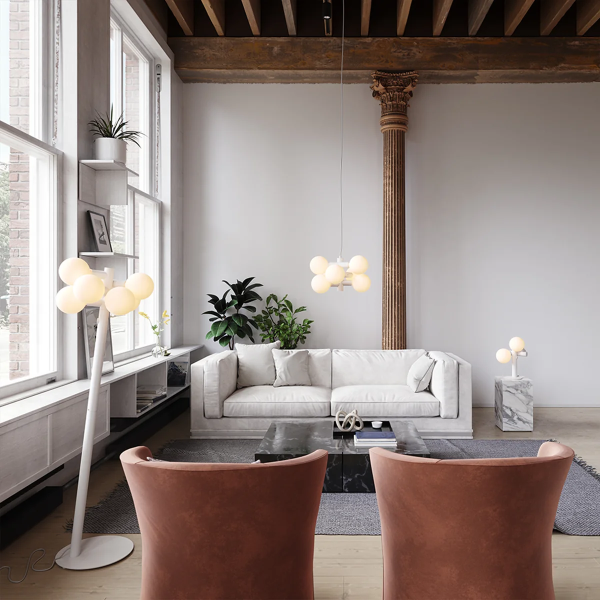 De Echo tafellamp bestaat uit drie kruisende stalen cilinders met een speciale draaidimmer aan de voet en is afgewerkt in een gedempte witte poedercoating. De Echo tafellamp wordt geleverd met twee Sphere IV-lampen, die ongeëvenaarde Dim to Warm-prestaties bieden.