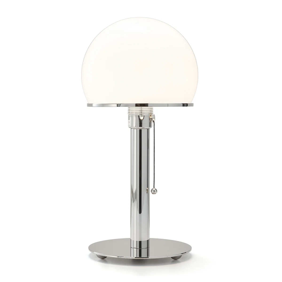 De WA24 Wagenfeld lamp bestaat uit een ondoorzichtige wereldbol; de basis, de standaard en de randen zijn van vernikkeld metaal. Metalen hersenhelften onder de basis, die niet te zien zijn, maken het licht licht lichtvoetig.