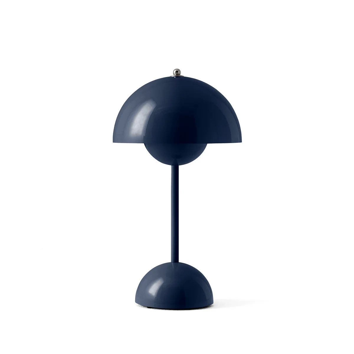 De Flowerpot tafellamp op batterijen VP9 van & Tradition , een vrolijk gekleurde lamp met een ronde voet en kap, belichaamt de experimentele houding van ontwerper Verner Panton. Licht, compact en vooral uitgerust met een oplaadbare batterij, is de draagbare VP9 de perfecte lichtbron voor gezellige avonden - of het nu in de woonkamer is of op het terras.