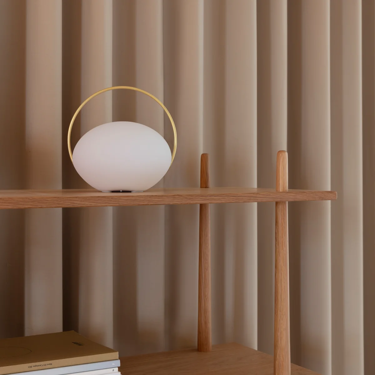 De Orbit LED oplaadbare tafellamp van ontwerper Philip Bro voor Umage betovert met zijn delicate, uiterst ongewone ontwerp. Orbit is geïnspireerd op de rotatie van de stand rond de aarde en is de perfecte aanvulling op je leefruimte - zowel binnen als buiten. De LED-lamp is gemaakt van melkachtig, wit plastic met verfijnde messing details. De lamp is snoerloos en dus gemakkelijk mee te nemen. De lamp heeft drie verschillende lichtstanden en kan eenvoudig worden in- en uitgeschakeld door de lamp iets te kantelen. De afzonderlijke standen kunnen ook worden gewijzigd. De batterij van de Orbit De batterij van de tafellamp gaat tot 20 uur mee en kan worden opgeladen via de meegeleverde draadloze oplader of de oplaadkabel.