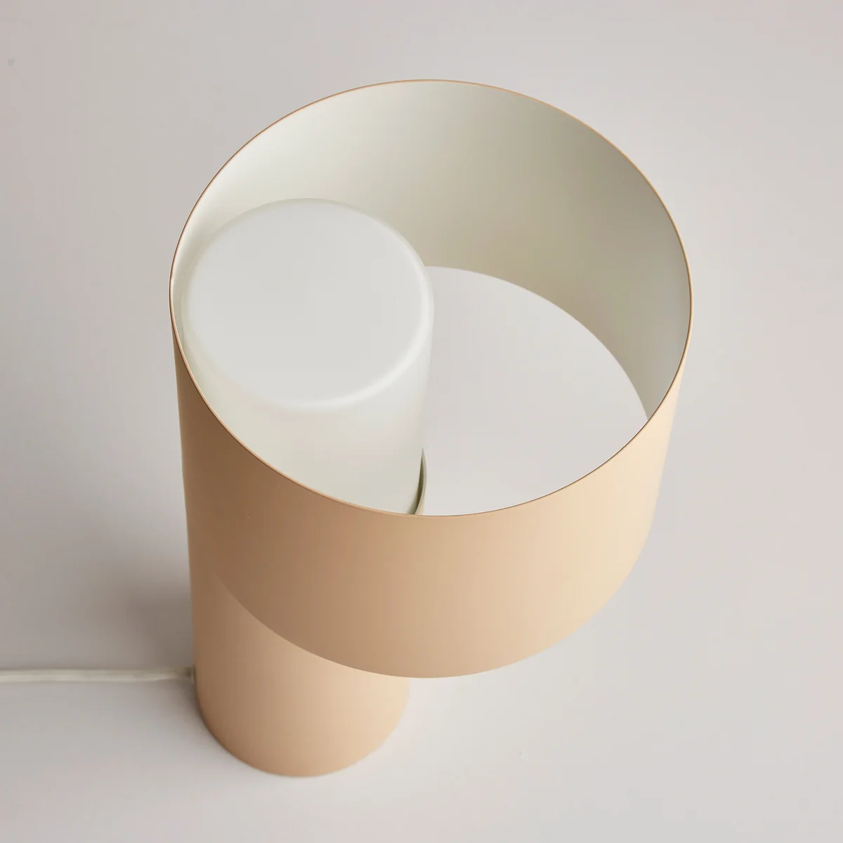 De Tangent tafellamp van Woud is ontwikkeld op basis van een experimentele studie met buizen en hoe deze proportioneel met elkaar verbonden kunnen worden. De armatuur van Frederik Kurzweg overtuigt met een duidelijk grafisch ontwerp waarin twee stalen buizen elkaar ontmoeten op hun tangentiële contactpunt. De kleine buis biedt ruimte voor de elektra, terwijl de grote buis dient als lampenkap.