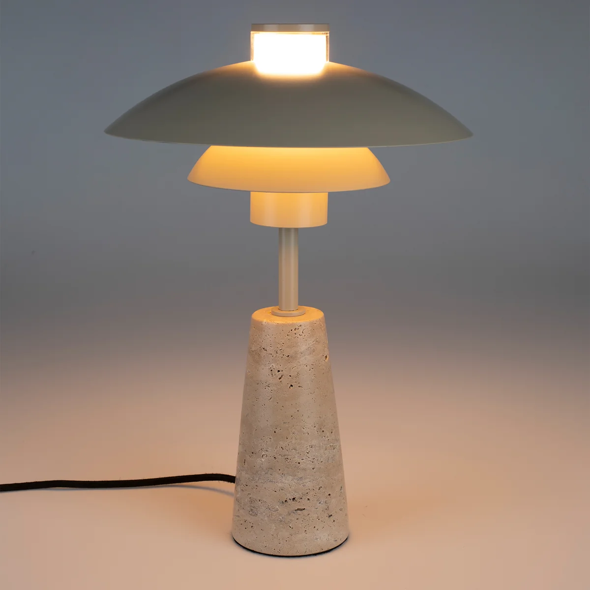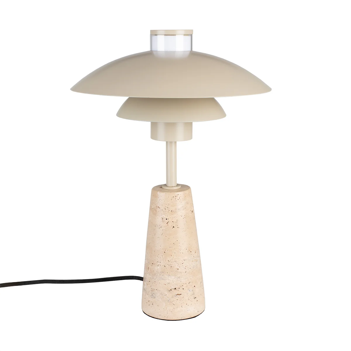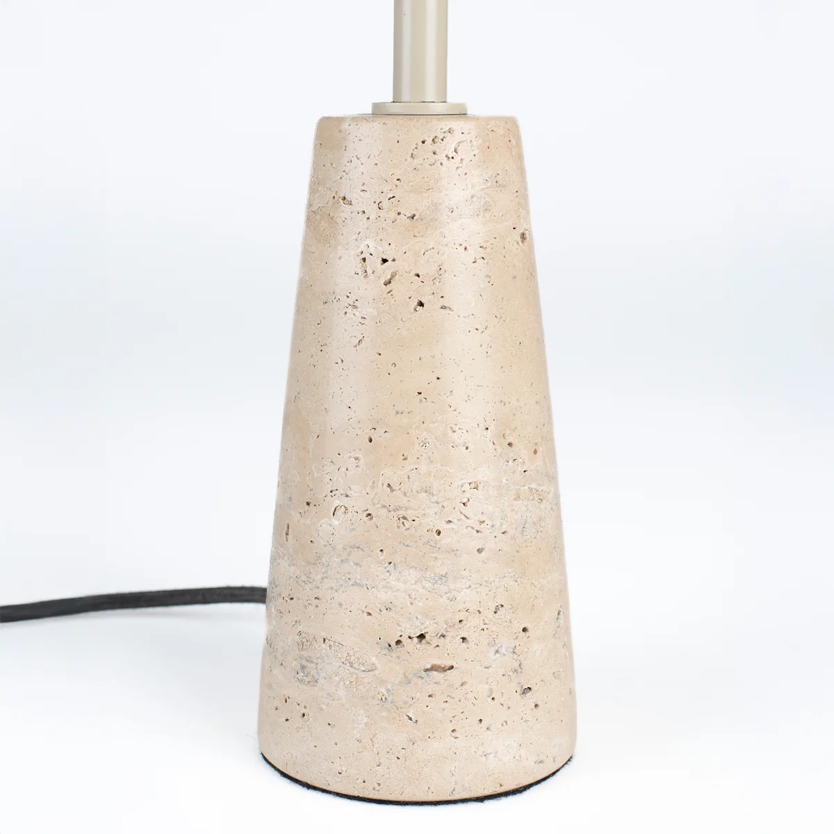 De zware voet van echt travertijn verankert de armatuur zowel visueel als fysiek en vormt een spannend contrast met de zwevende lichtheid van de kap. Cole Deze lamp is ideaal als stijlvol accent op dressoirs, ladekasten of bijzettafels - vooral in moderne, natuurlijke interieurs.