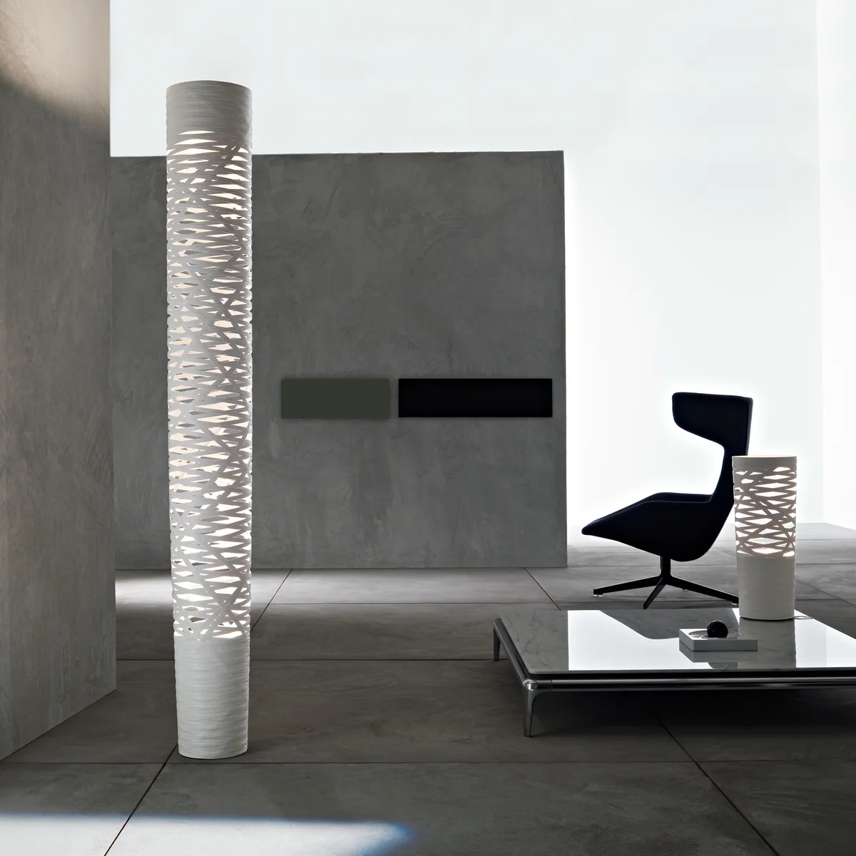 De Tress vloerlamp van Foscarini is gemaakt van een composietmateriaal van gelakte glasvezels. In twee verschillende maten en in verschillende kleuren: Wit, Zwart en Rood, verschijnt de Tress vloerlamp ofwel discreet elegant, mannelijk aanwezig of met een vurige uitstraling.