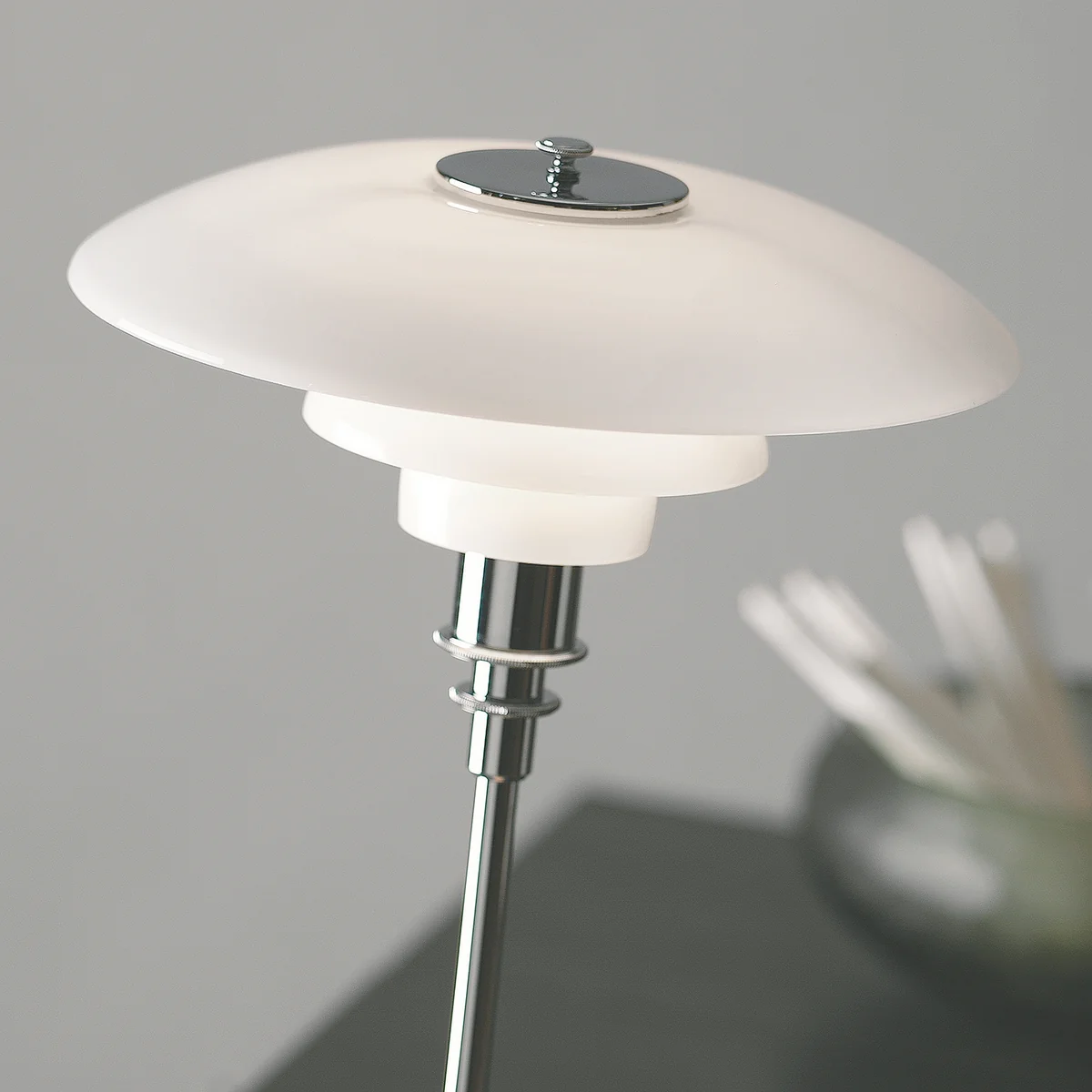 De lampenkap is ontworpen volgens het principe van een reflecterend drievoudig systeem, zodat het grootste deel van het licht naar beneden gericht is en dus zonder schittering wordt uitgestraald. De armatuur is gemaakt van handgeblazen, geopaliseerd glas met een matte binnenzijde en bevordert een diffuse lichtverdeling. Dit maakt de Louis Poulsen vloerlamp tot een welkome metgezel in het woongedeelte, waar het een huiselijke sfeer creëert naast de bank of de fauteuil.