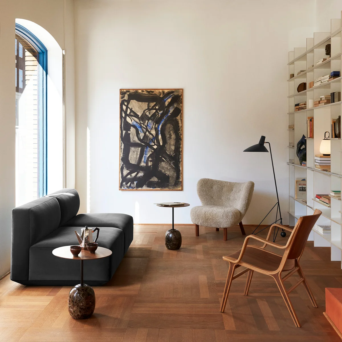 Tripod HM8 De vloerlamp van & Tradition & weerspiegelt het heldere minimalisme van Hvidt Mølgaard. De vloerlamp van gelakt aluminium en staal met messing details creëert een mooie balans tussen de strikte eenvoud van het ontwerp en de zachtheid die ontstaat door de gebogen randen van het driepotige frame. Hoewel de lamp al in 1953 werd ontworpen, wordt hij nu voor het eerst door & Tradition gelanceerd.
