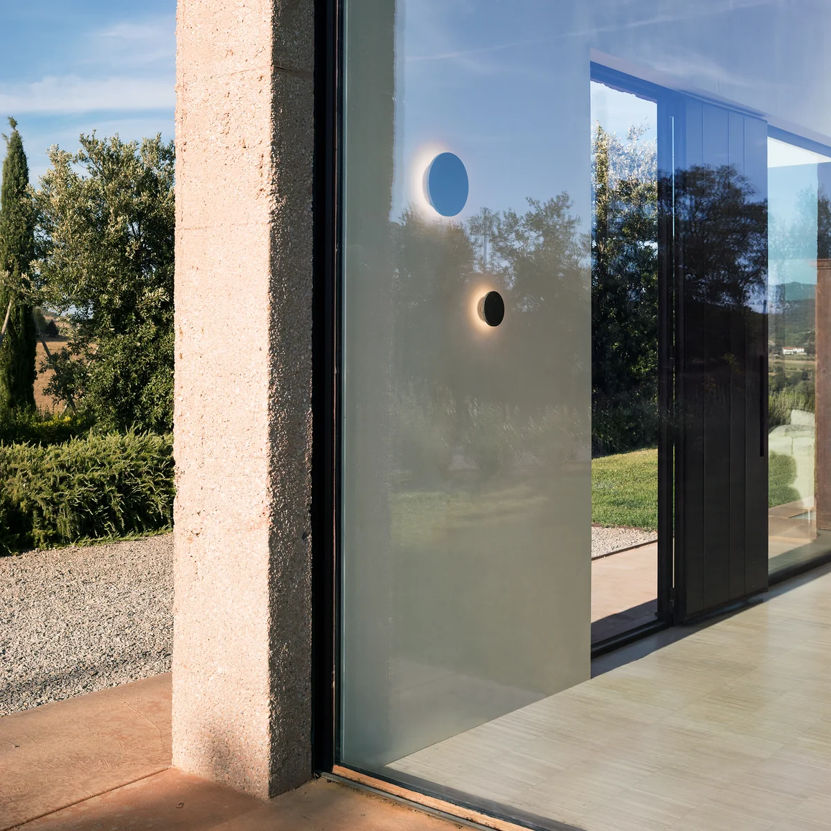 Ingeschakeld straalt de ronde armatuur echter indirect licht uit en inspireert met een optisch effect dat doet denken aan een zonsverduistering. Rondom het armatuur schijnt zacht, warmwit licht dat een gezellige sfeer creëert en tegelijkertijd de entree voldoende verlicht. Als er meerdere armaturen aan de muur worden gemonteerd, kunnen hele paden worden verlicht, wat vooral in het donkere seizoen een voordeel is.