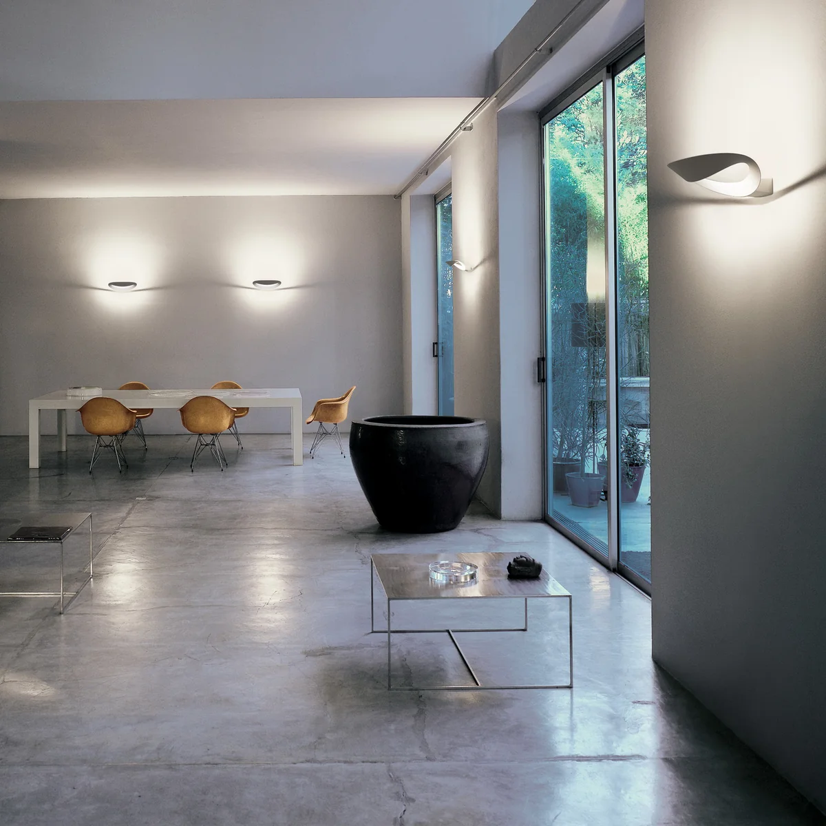 De LED-wandlamp Mesmeri van Artemide overtuigt door zijn gedurfde, elegante vorm die naadloos in elke sfeer past. Toch is het eenvoudig genoeg om niet de aandacht te vestigen op het ontwerp, maar op het warmwitte licht dat het uitstraalt. Dankzij de grote opening schijnt het licht van de verborgen LED-lichtbron gelijkmatig naar boven en naar beneden en creëert het zelfs interessante schaduwen op de muur. Dit is nog een reden waarom verschillende Mesmeri-wandlampen perfect kunnen worden gecombineerd en bijvoorbeeld als verlichting voor gangen of grote kamers.
