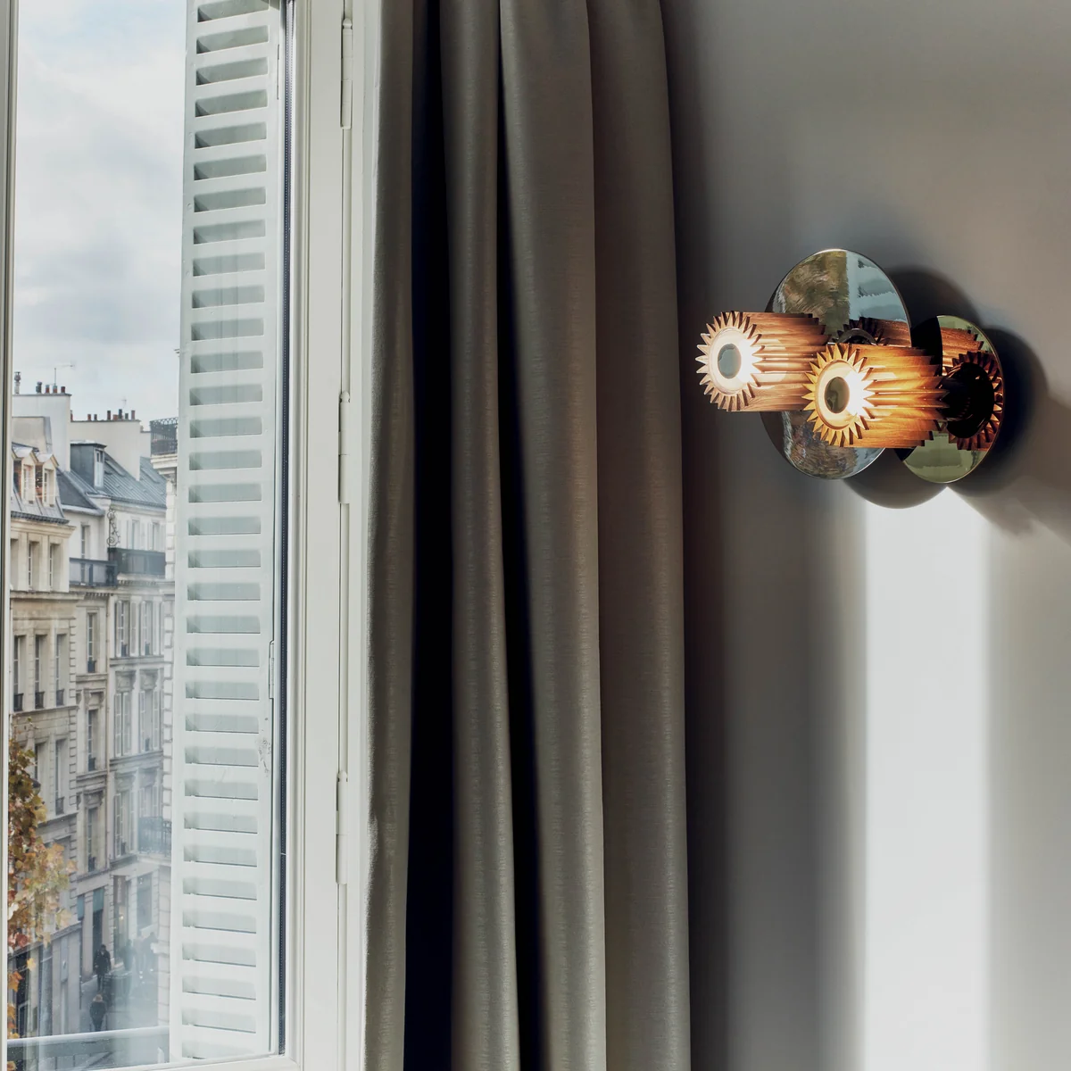 De In the Sun wandlamp van DCW is ontstaan in het kader van de renovatie van het Dufour Paviljoen in het Chateau de Versailles. Het is een eerbetoon aan de Zonnekoning, ontworpen door Dominique Perrault en Gaëlle Lauriot-Prévost. In particuliere woningen schijnt de wandlamp in feestelijke goud- en zilvertinten en werpt hij unieke schaduwen op de muur. Het resultaat is een magische sfeer waar het ook gebruikt wordt, of het nu in de gang is, boven het bed in de slaapkamer, boven de bank in de woonkamer.