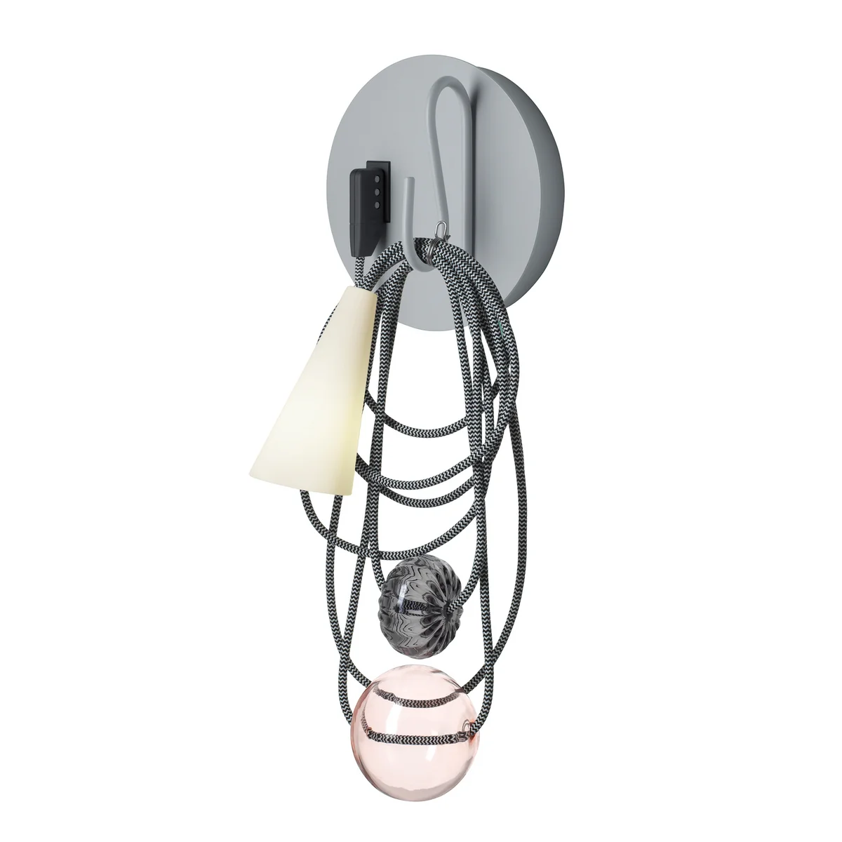De Filo wandlamp is verkrijgbaar in verschillende uitvoeringen waarbij de kleur van de kabel en de ballen variëren.