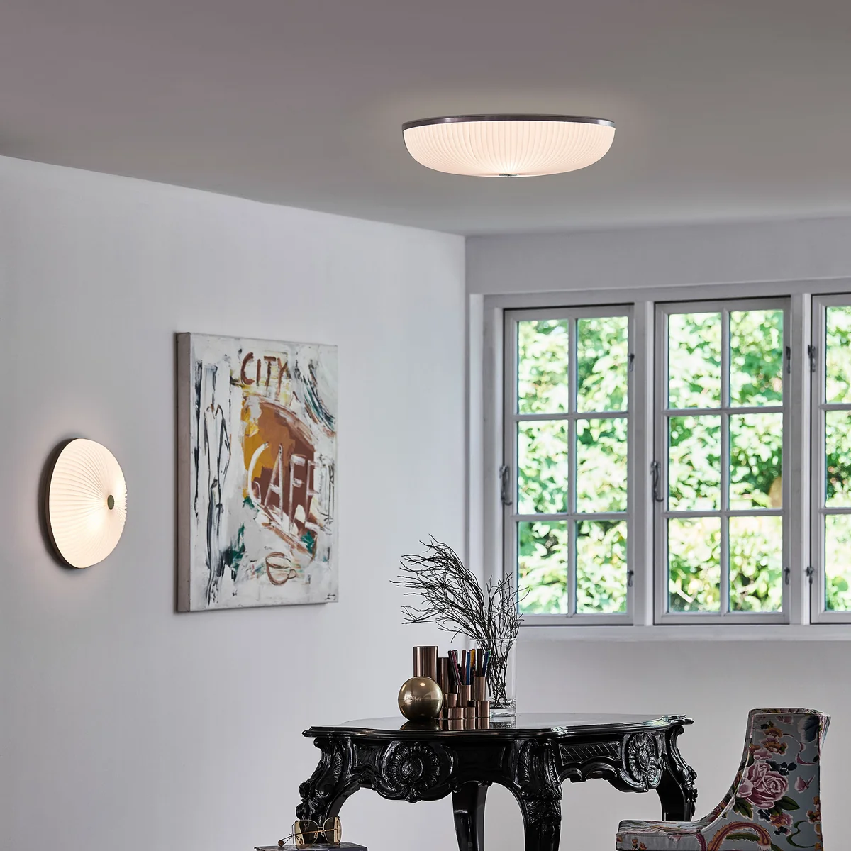 De armatuur is gemaakt van kunststof en is verkrijgbaar in verschillende diameters. Details in zilver of goud ronden het ontwerp af en creëren een tijdloos licht dat een blikvanger wordt. Lamella is een praktische en mooie verlichtingsoplossing, zowel alleen als in verschillende maten, met meerdere aan de muur of het plafond.